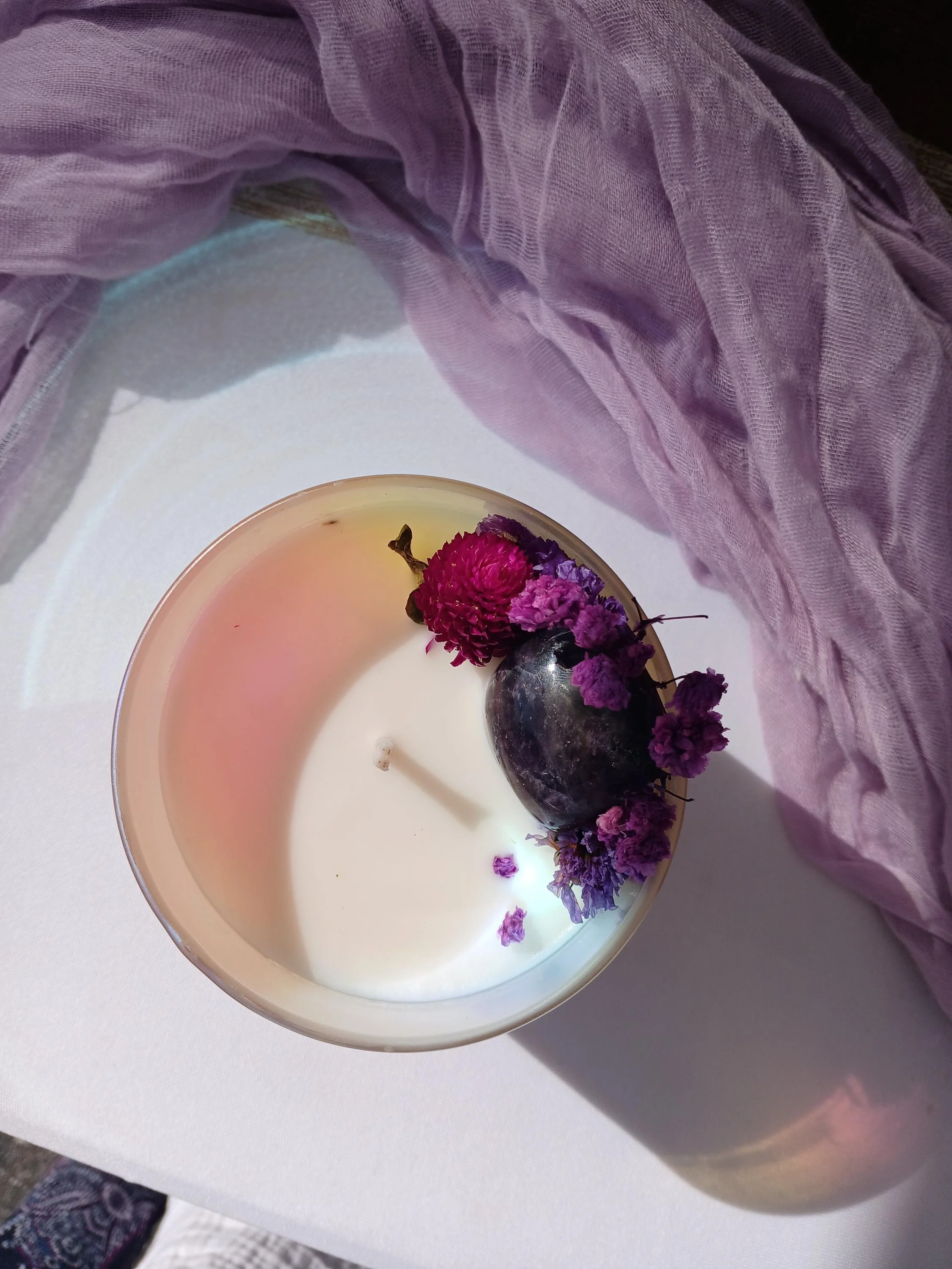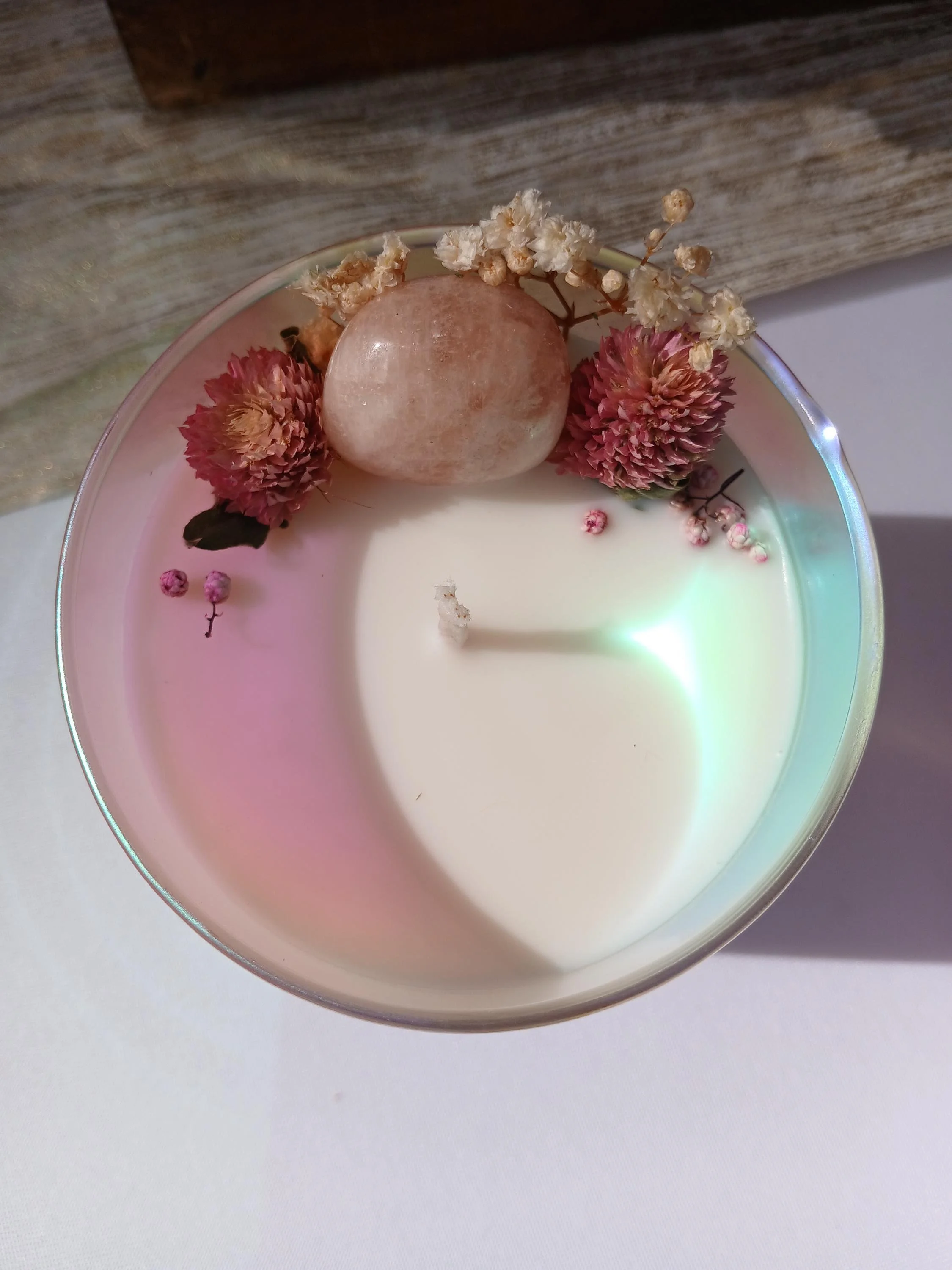 The colors aren't edited! These iridescent jars absolutely glow and make the most beautiful colors depending on the light. All of the angel number candles are one of a kind, but use aromatherapy and crystal energy to enhance the angel number message.