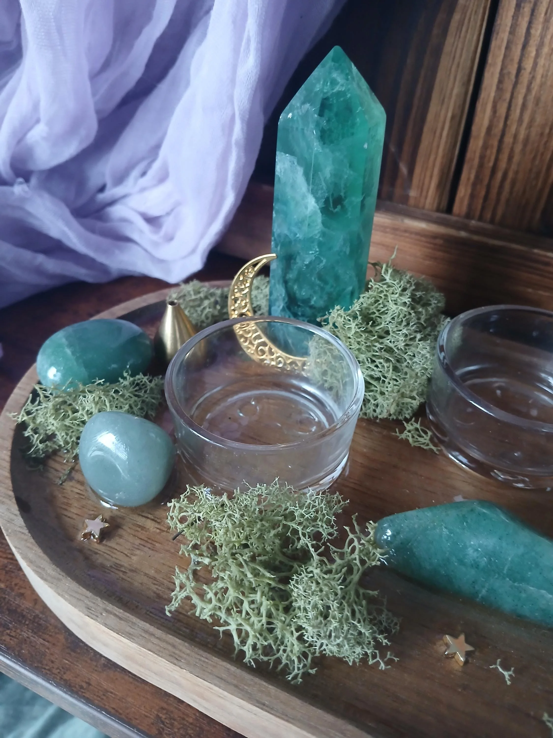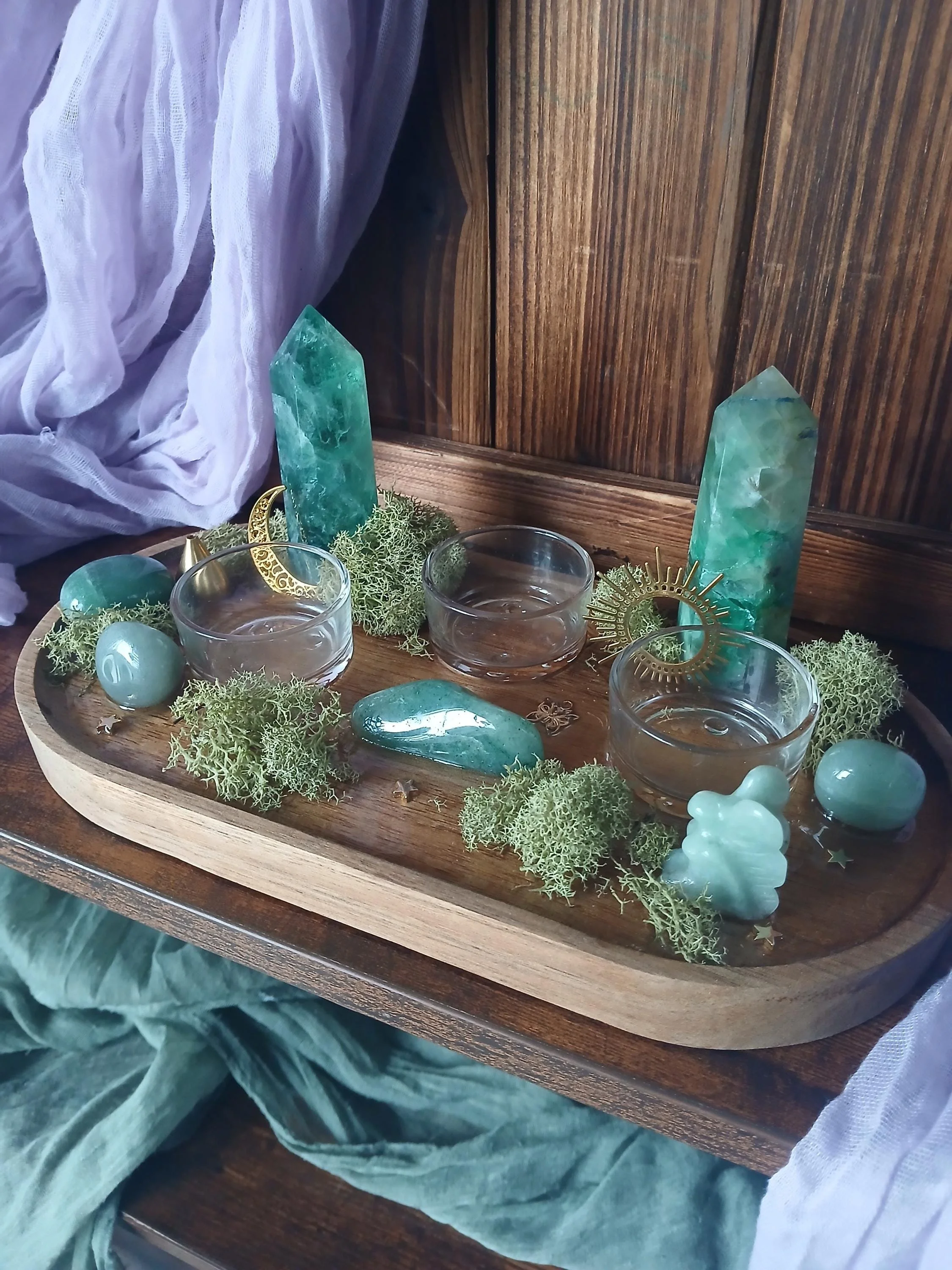 Abundance and Healing - crystal altar with green aventurine and fluorite towers