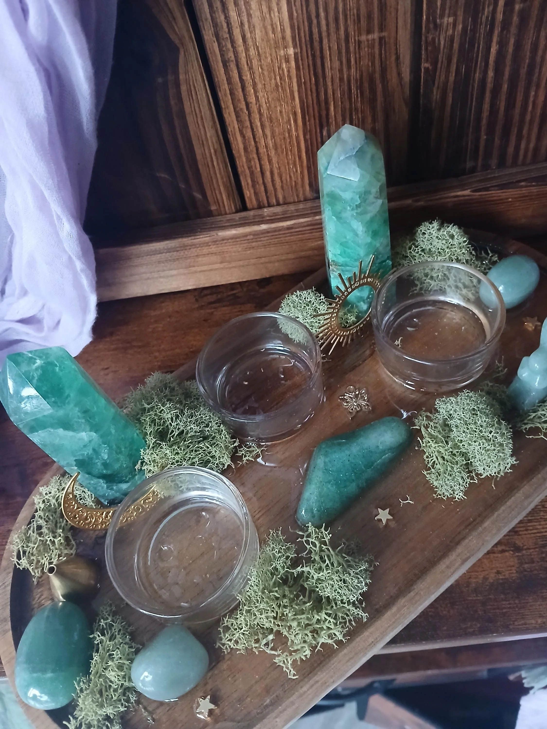 Harmonious Healing features two green fluorite towers to strengthen focus, order, and clarity, balancing and purifying the space to enhance healing, green aventurine tumbles and fairy angel - the stone of luck, increasing abundance, prosperity, success in careers, and a green agate for serenity, confidence, and to support health and vitality. Set in resin, this one of a kind altar is completed with gold sun and moon charms, a gold incense holder and three tealight holders.