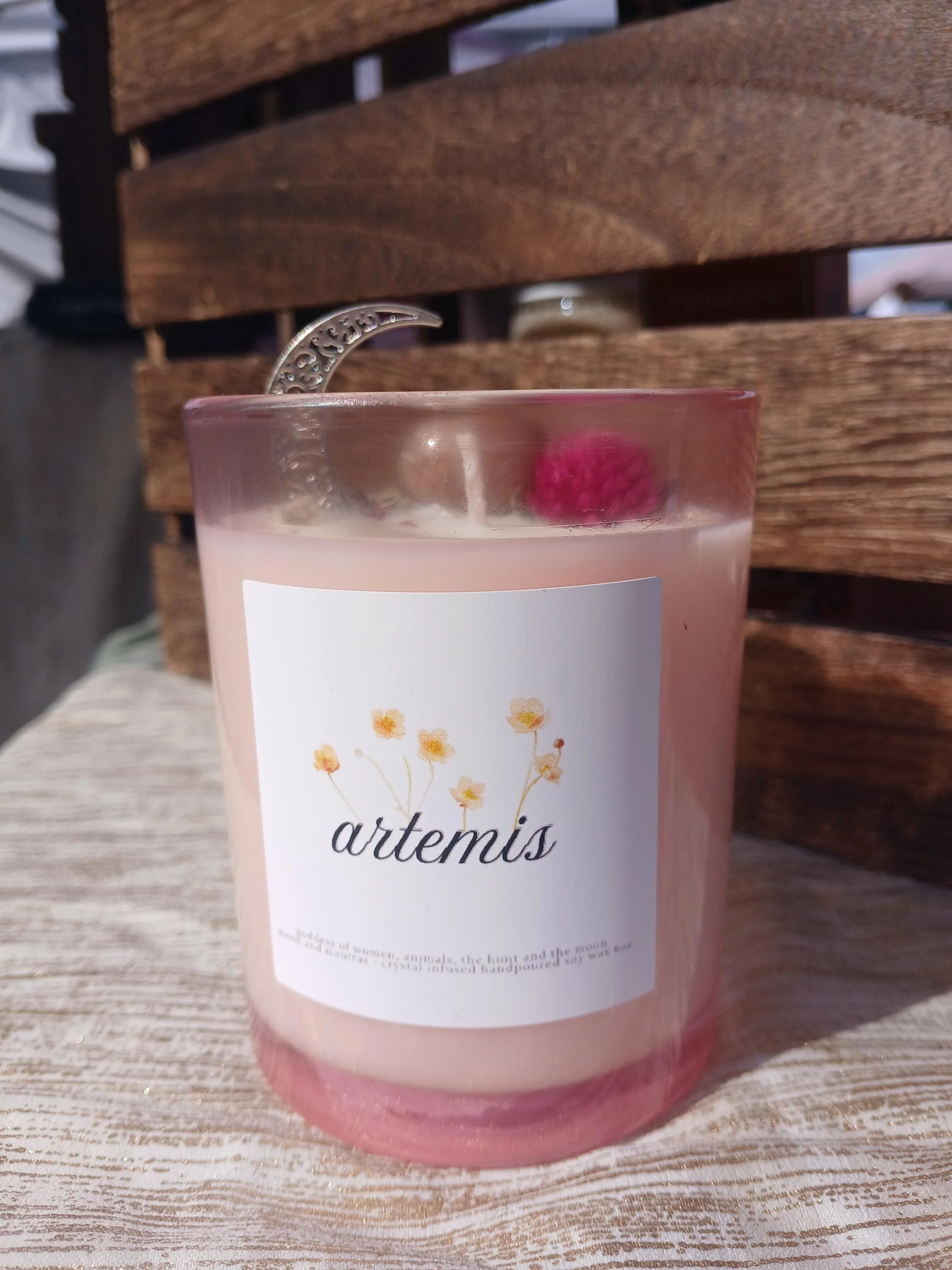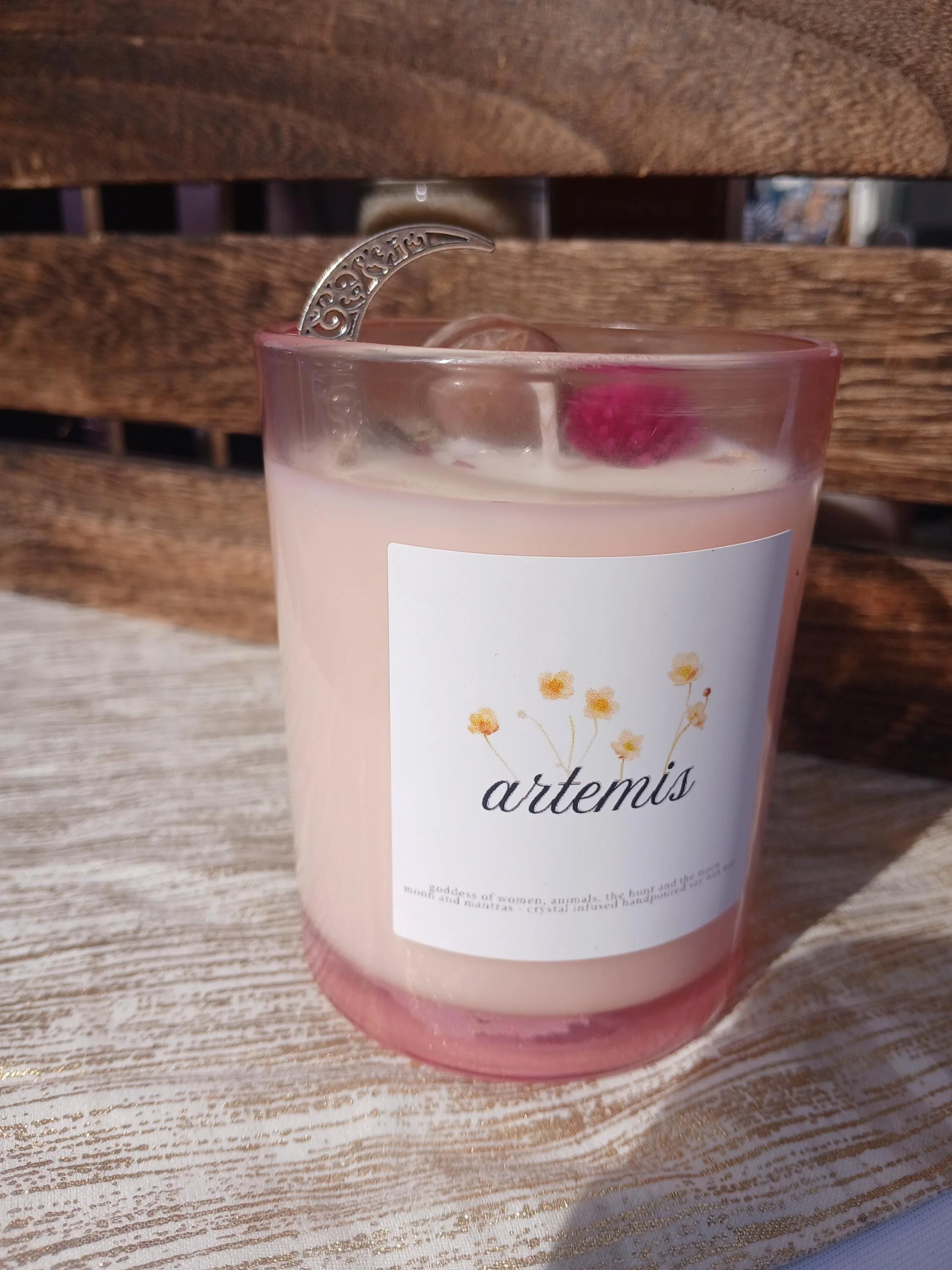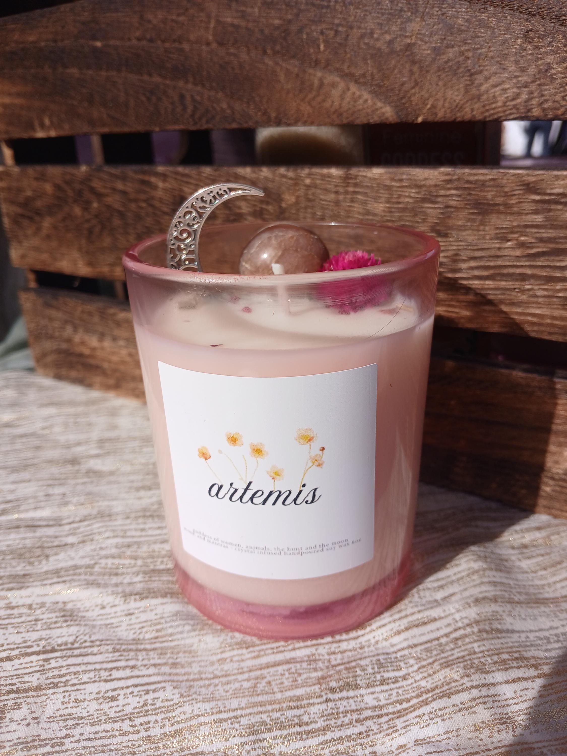Artemis Goddess Candle with a moonstone crystal and moon charm