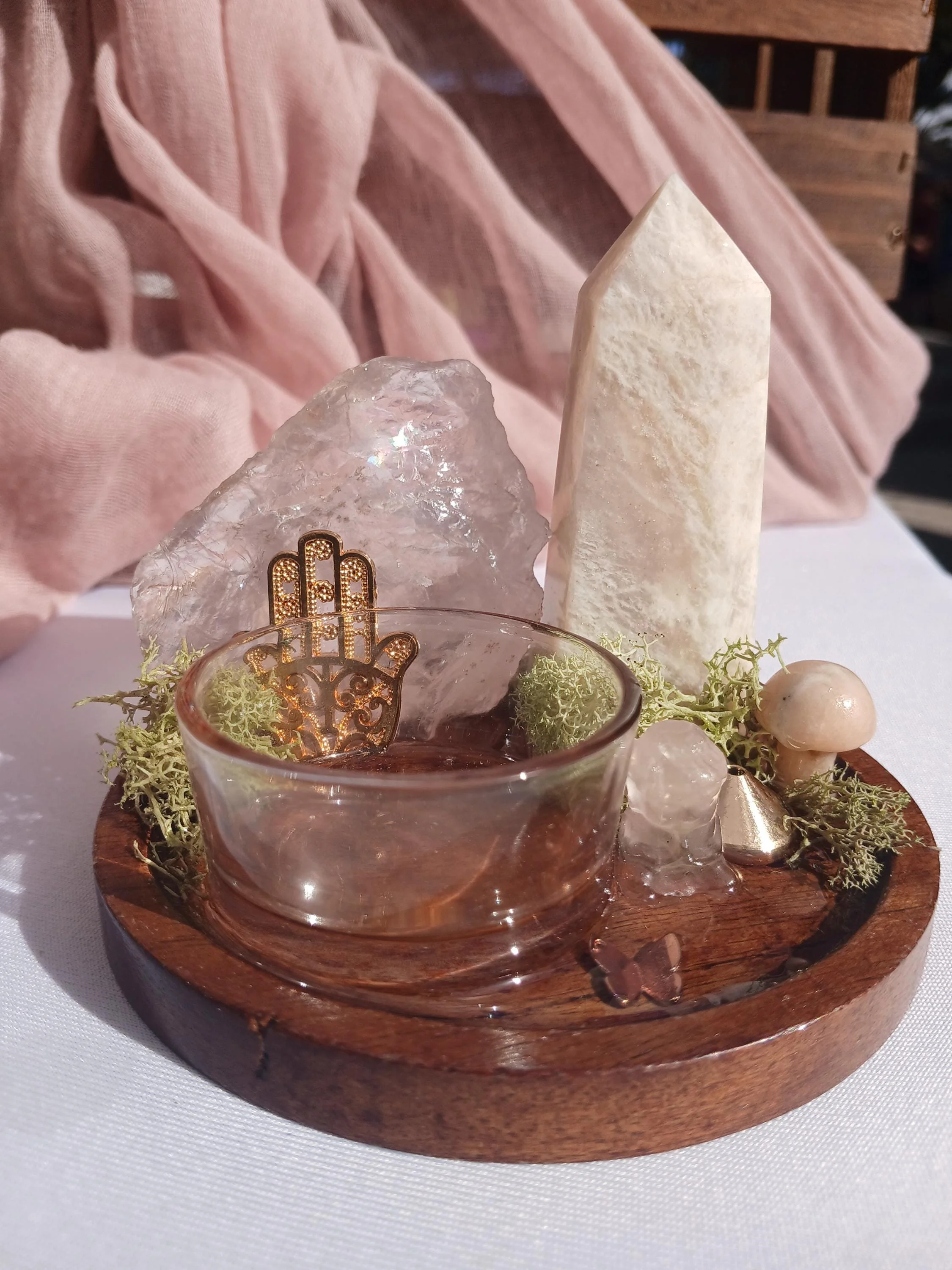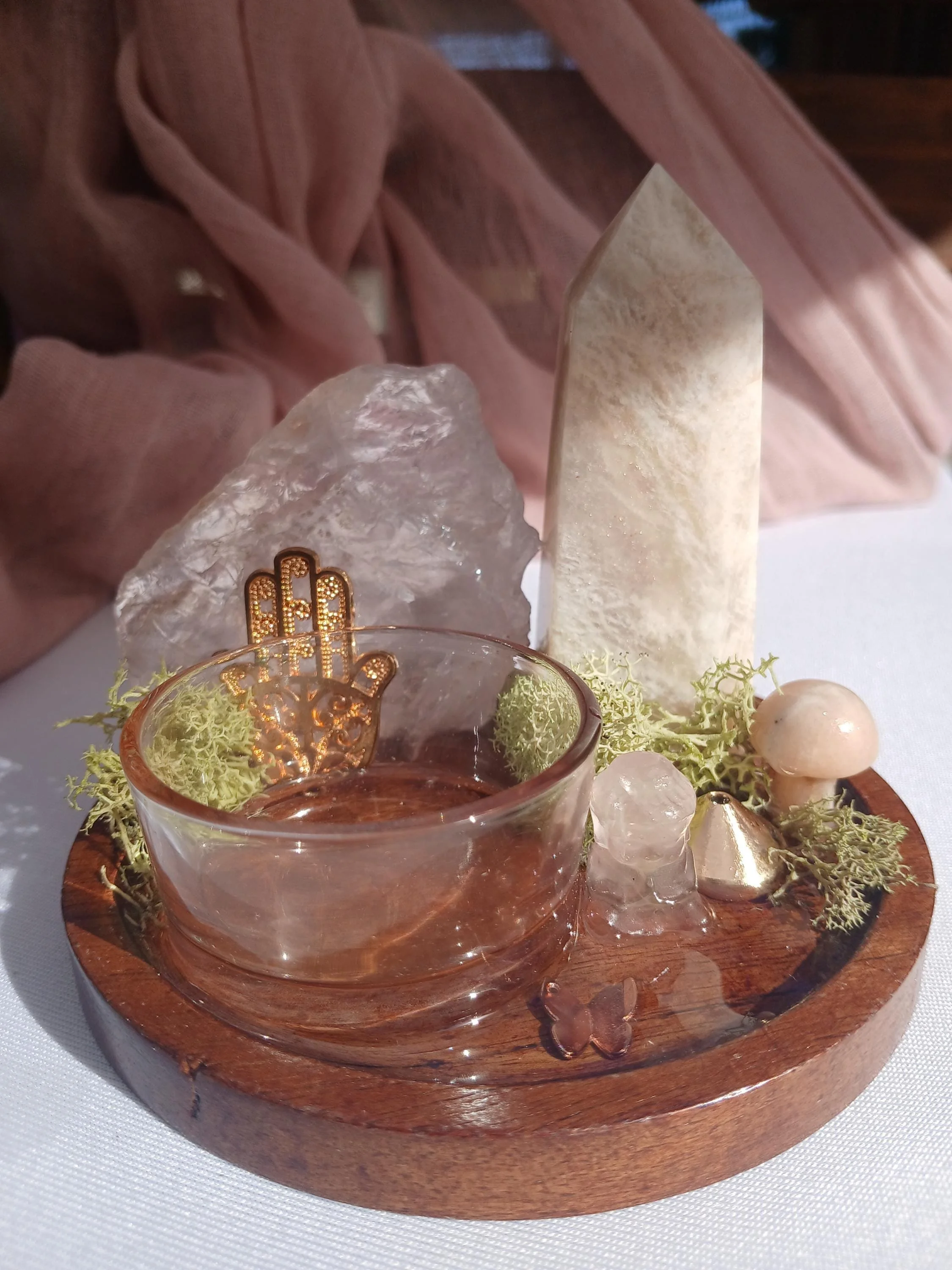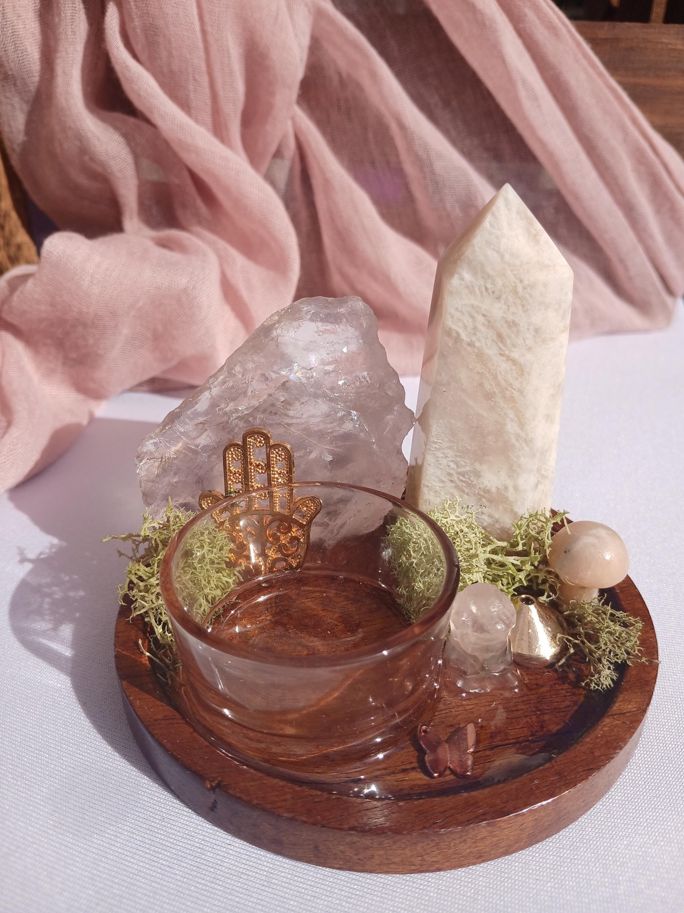 This crystal candle holder and altar is inspired by meditation practices and is meant to connect you to your heart center and feelings of peace and contentment.