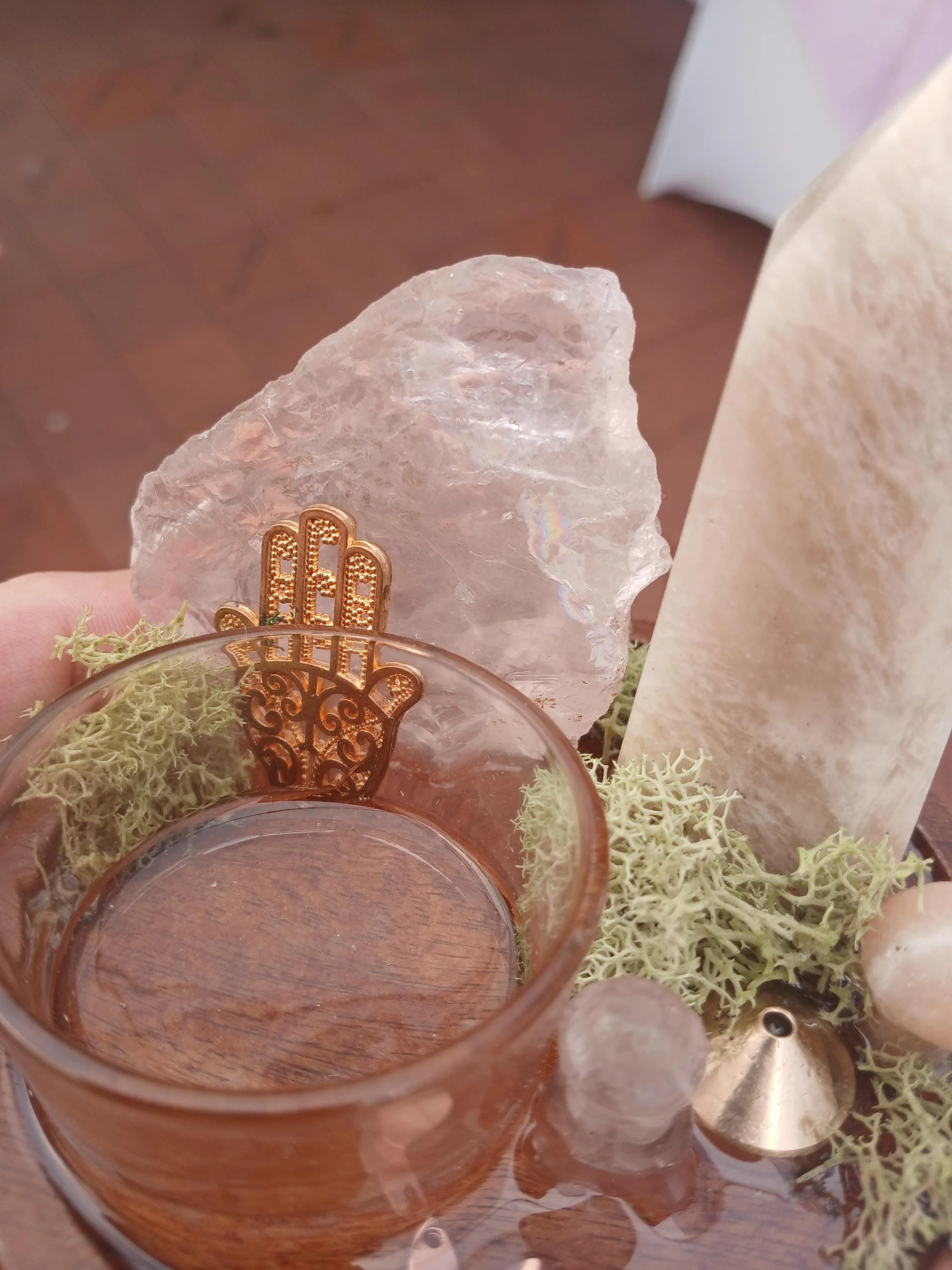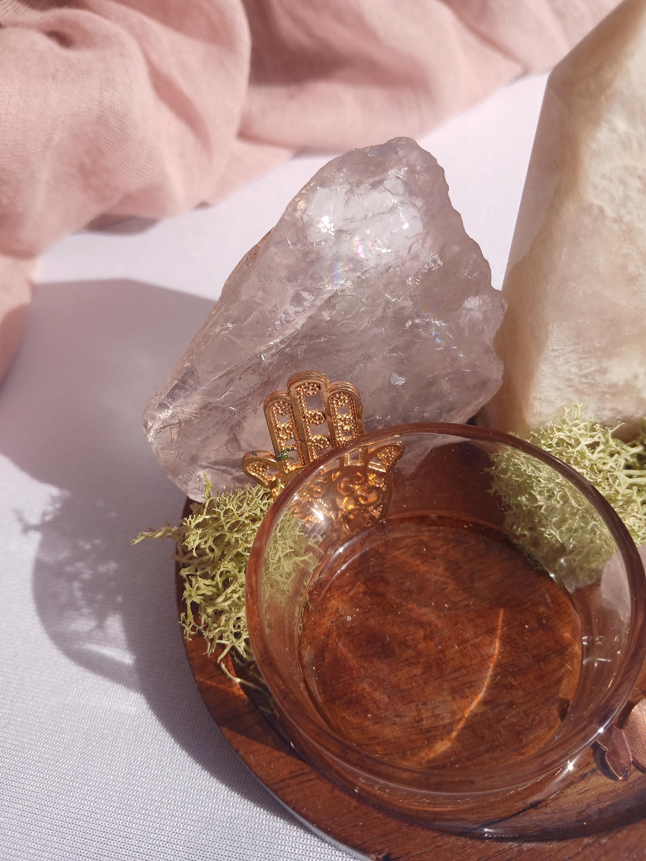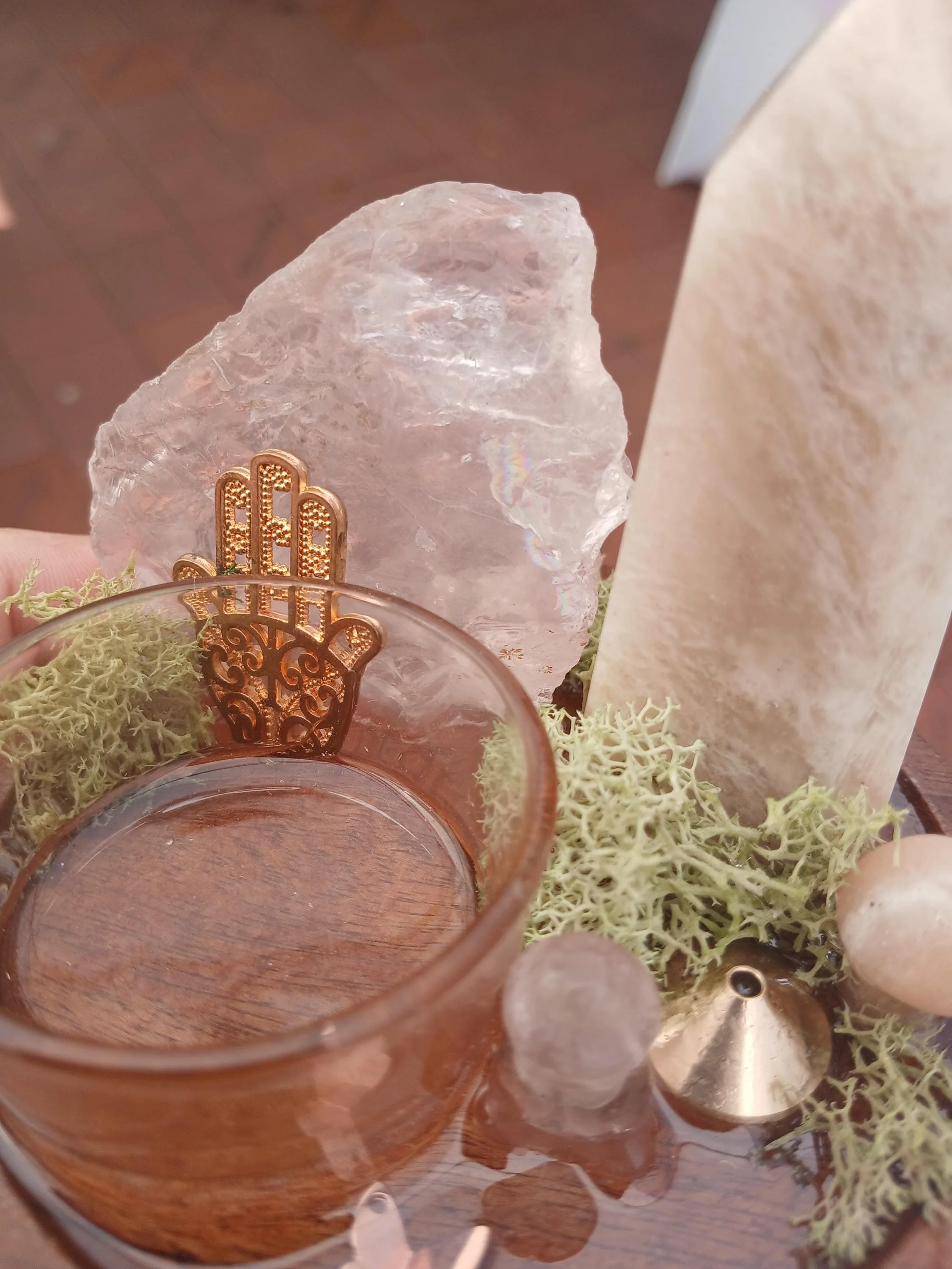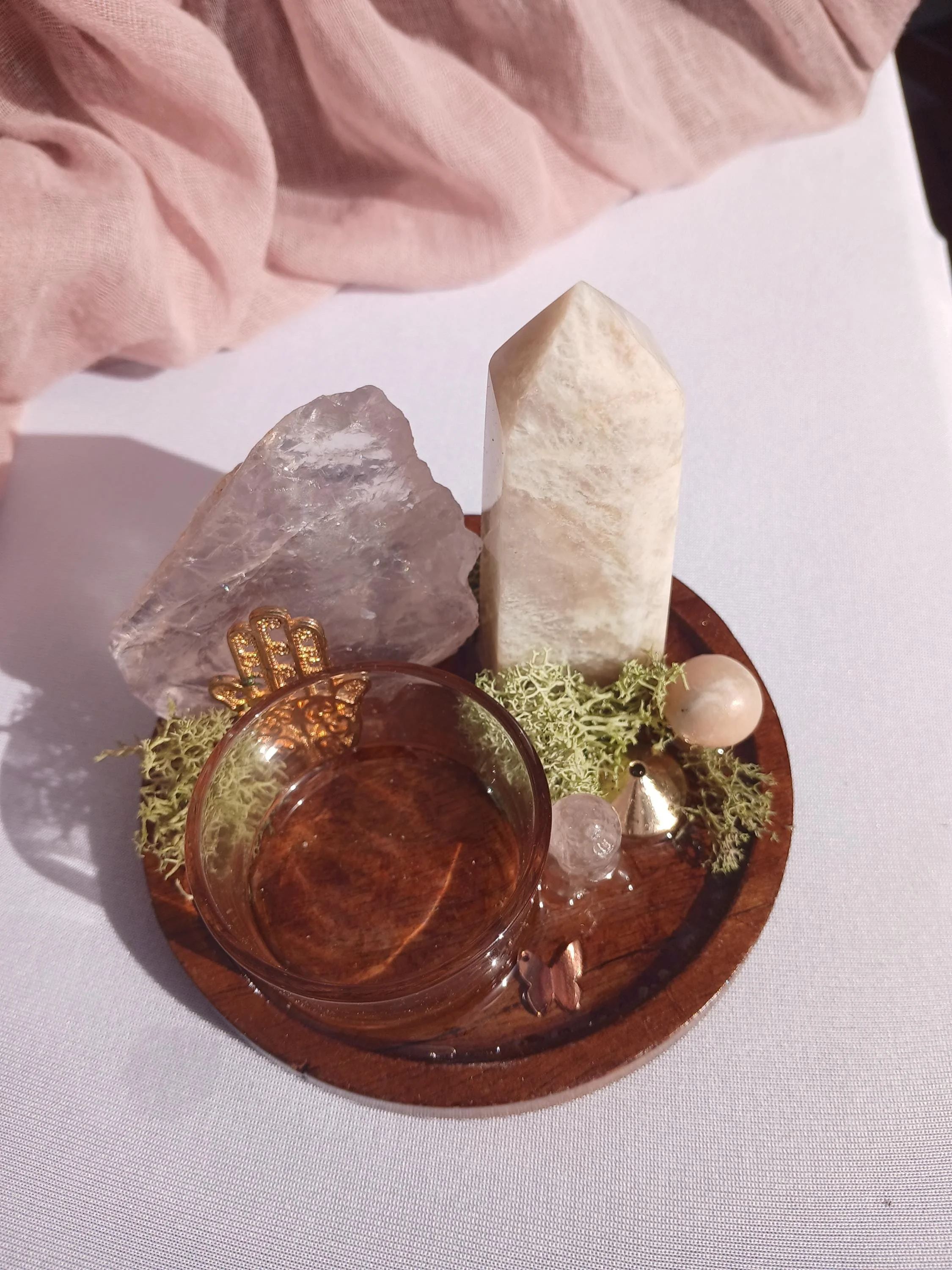 This crystal candle holder and altar is inspired by meditation practices and is meant to connect you to your heart center and feelings of peace and contentment.