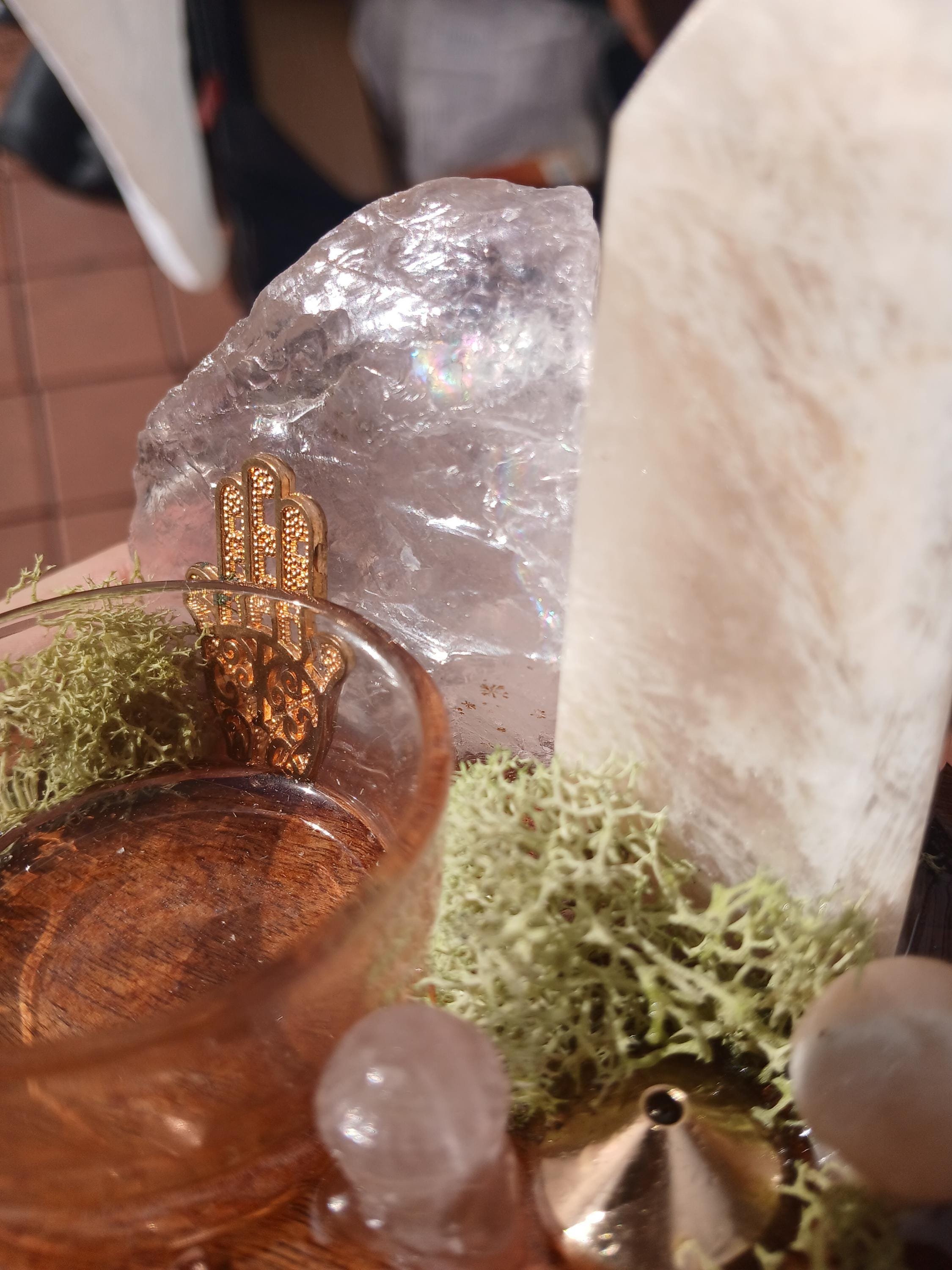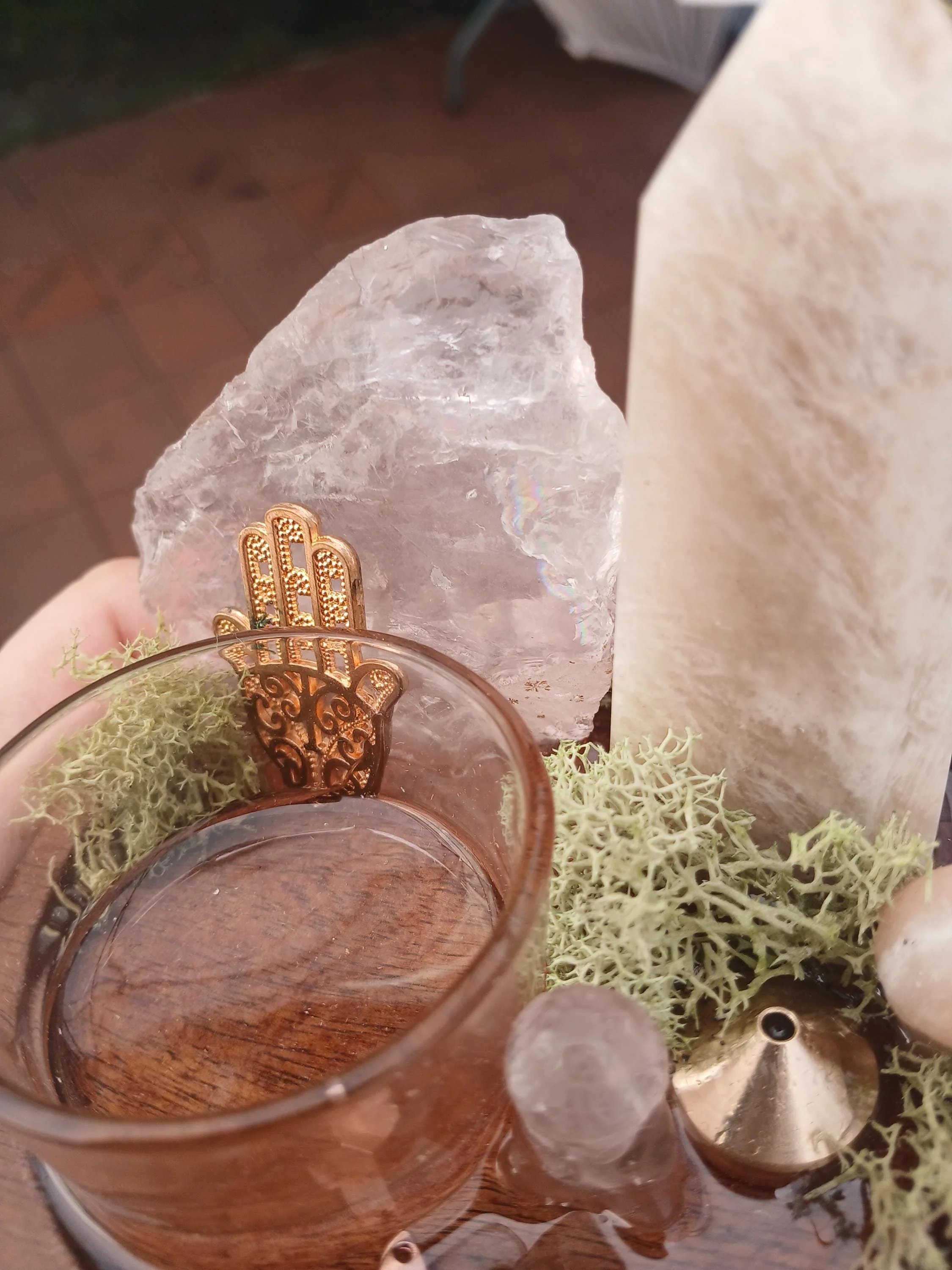 This altar is set in resin and enhanced with a hamsa - an ancient symbol of protection, incense holder, and butterfly charm for inspiration and enjoyment for years to come.