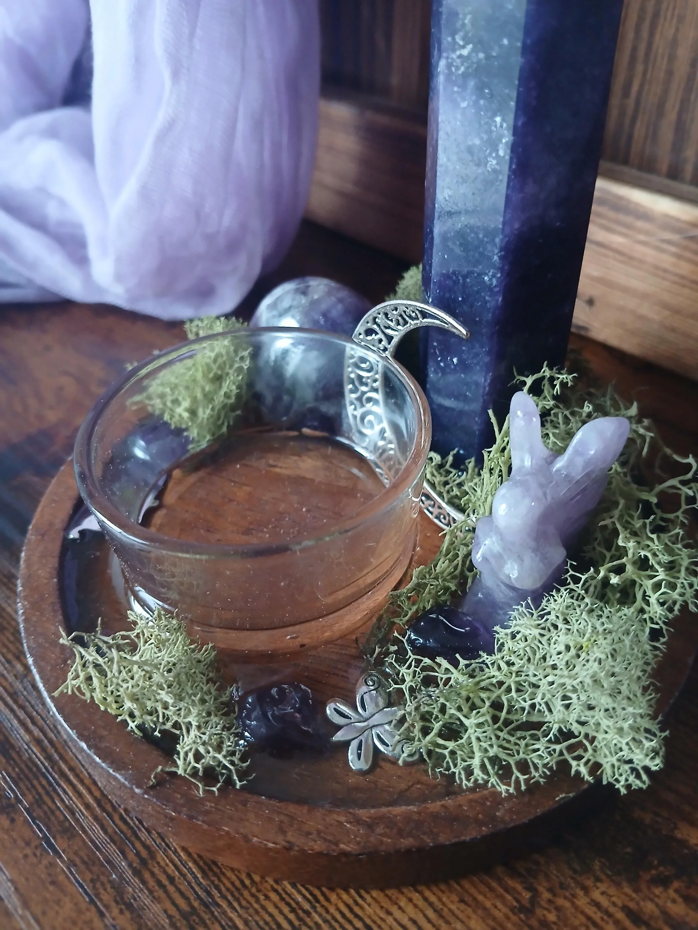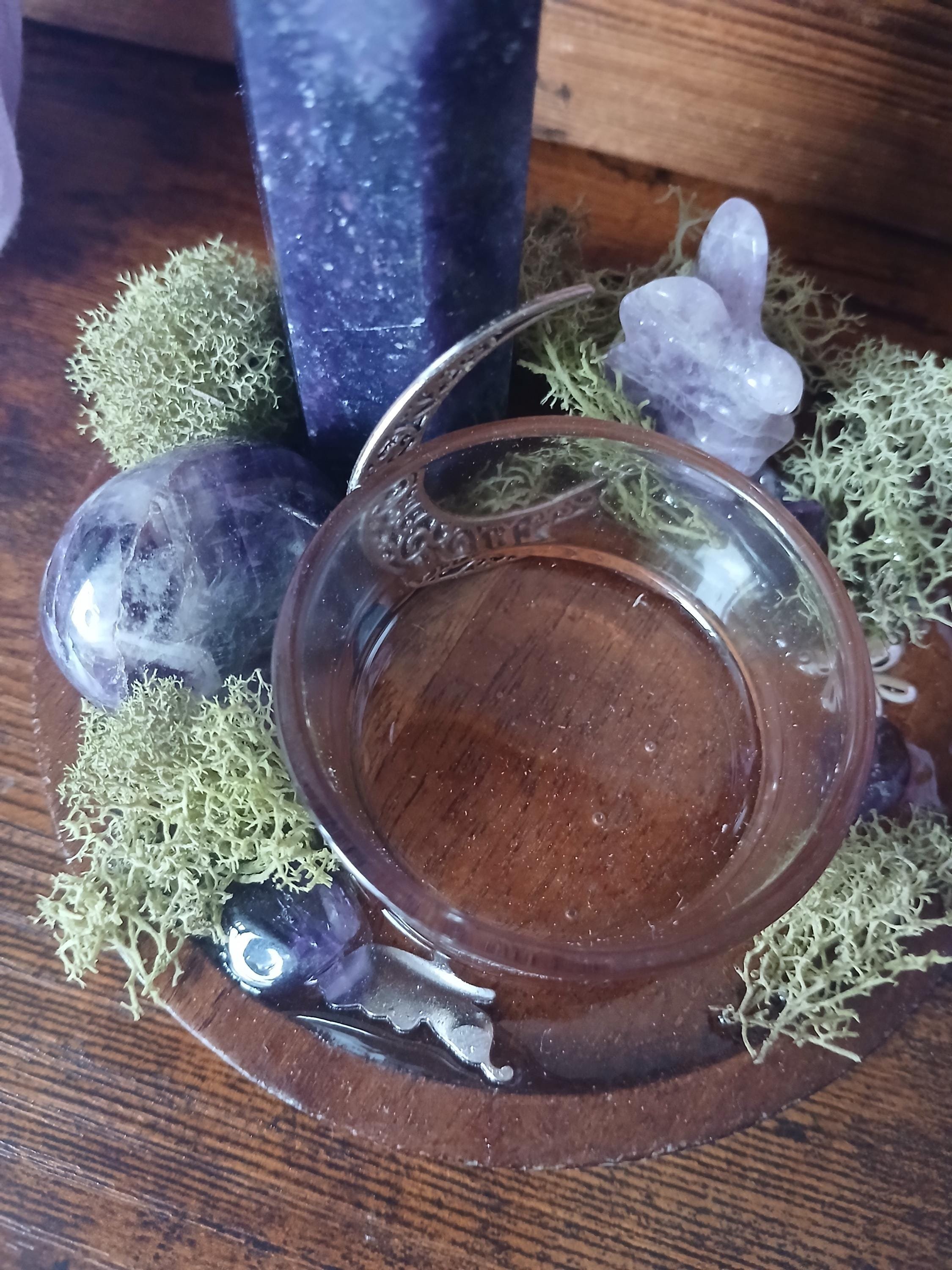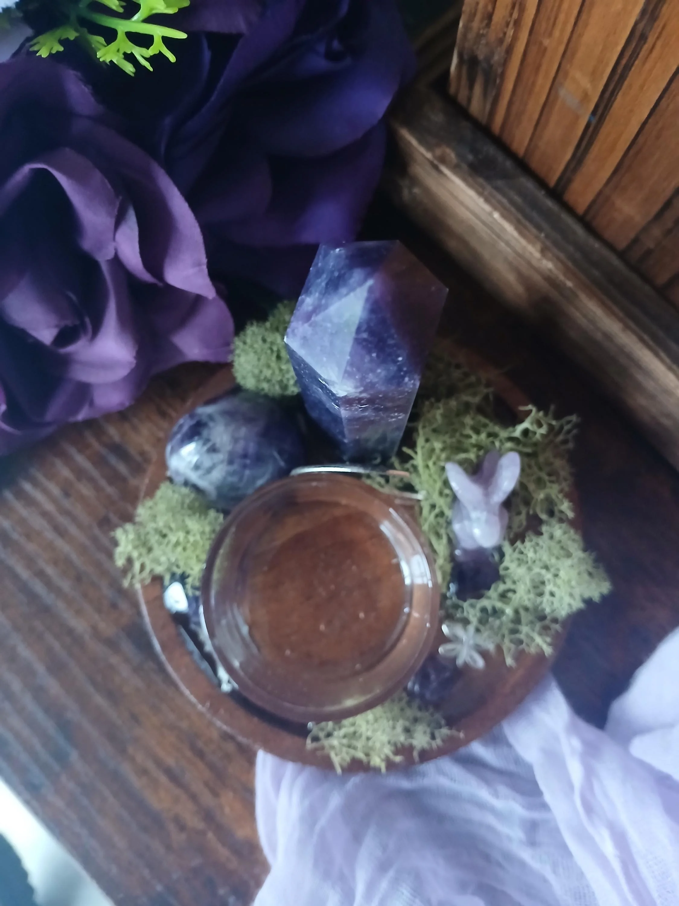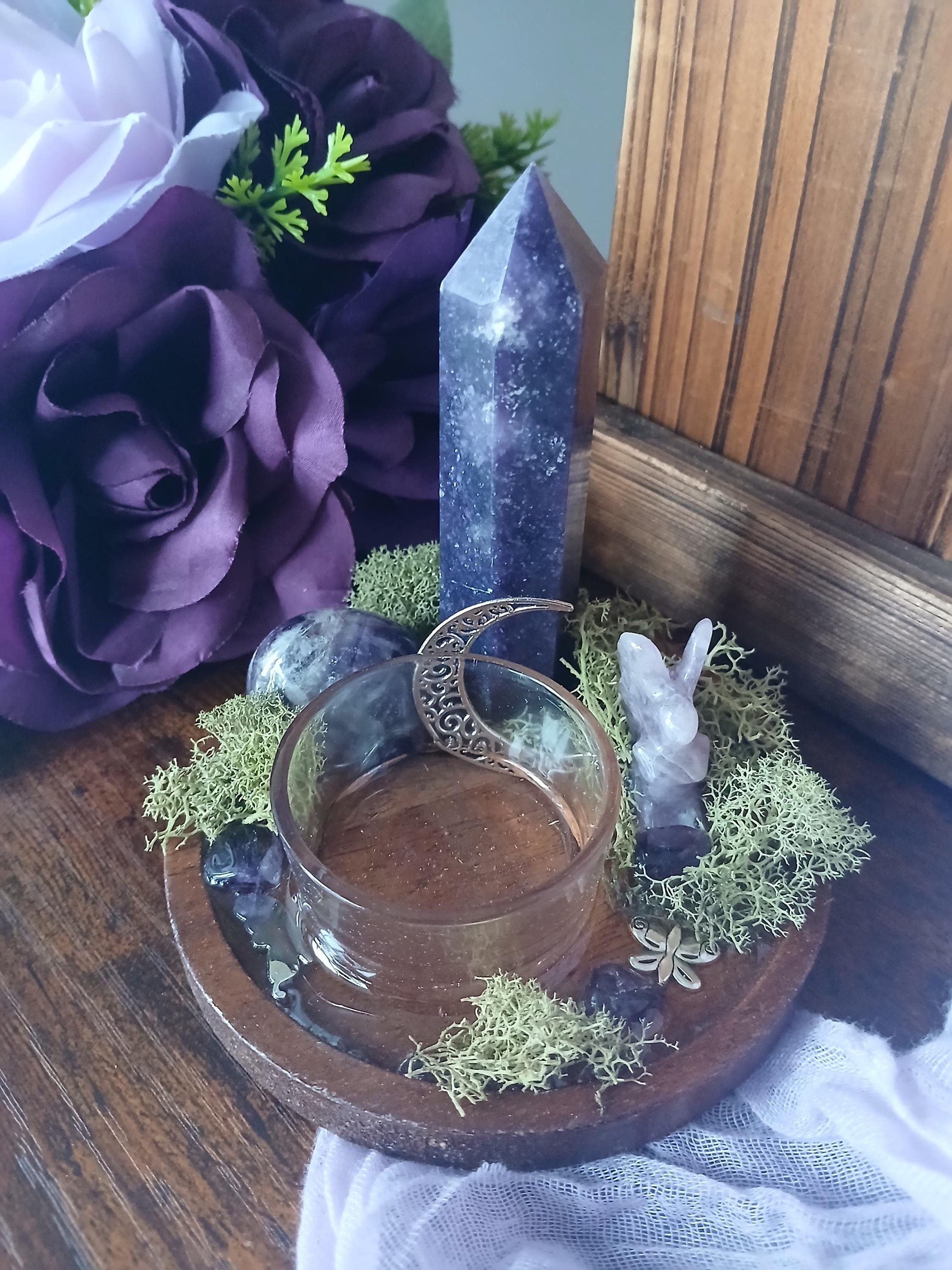 This one of a kind altar is designed to bring peace into your space. With amethyst to provide protection while promoting healing, lepidolite enhances the release of anxiety and depression, creating a positive mindset and a reminder to stay in the present moment. A tealight holder is added, along with silver butterfly charms and an amethyst angel fairy, these altars are set in resin and can be easily transported, cleaned and enjoyed for years to come.