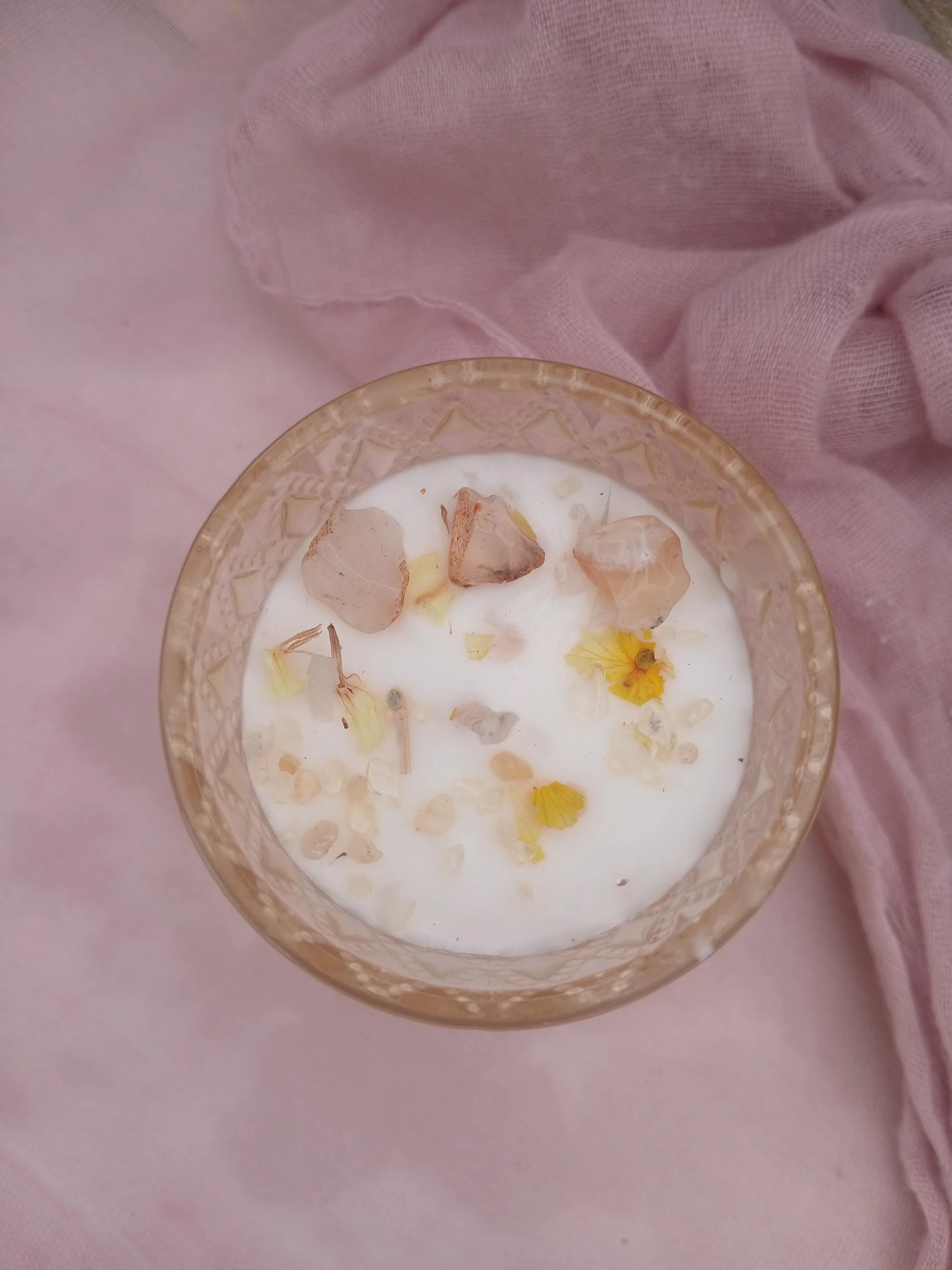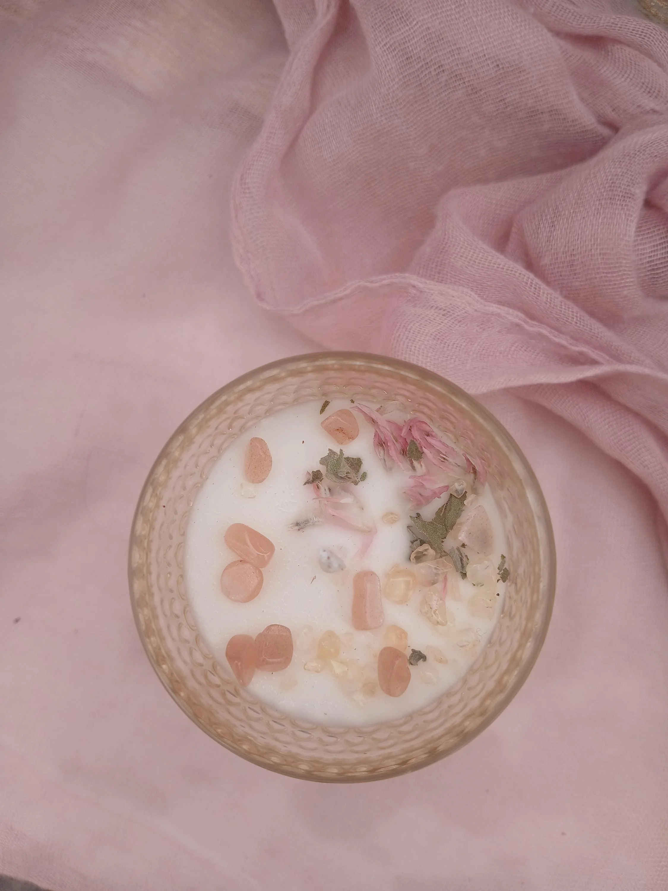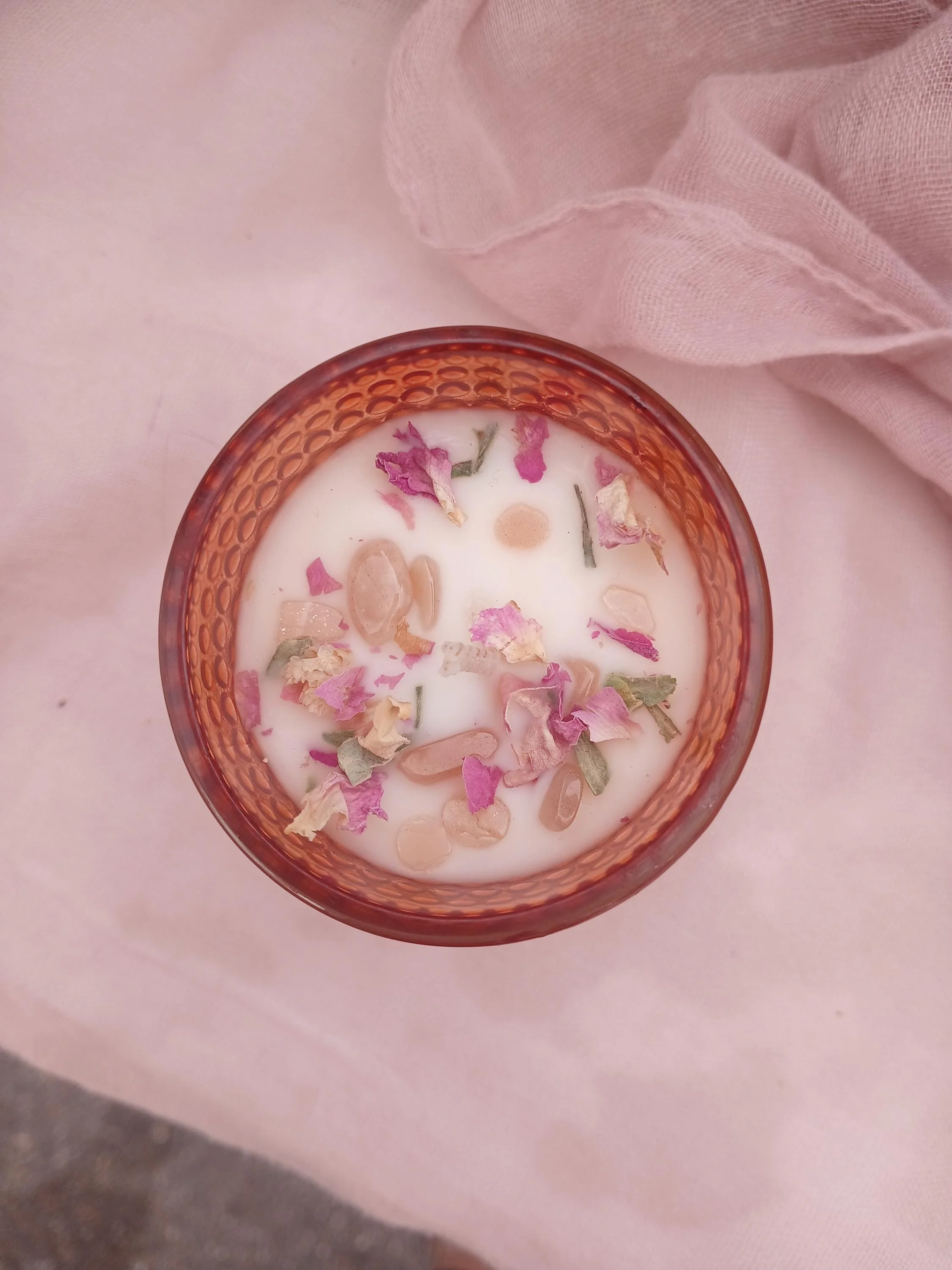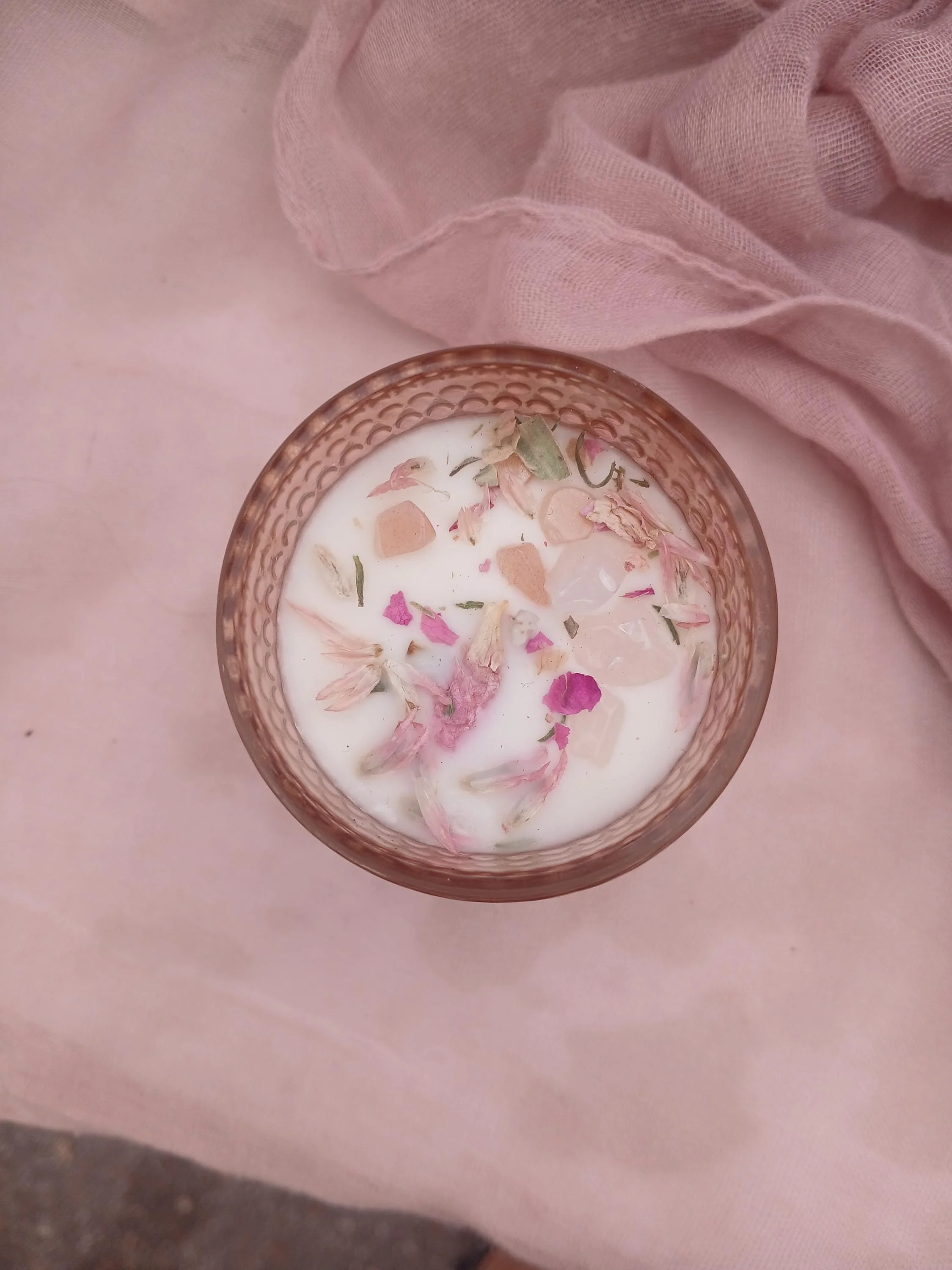 On top - pink salt, rose bud and petals, cherry blossom petals, rose quartz and carnelian