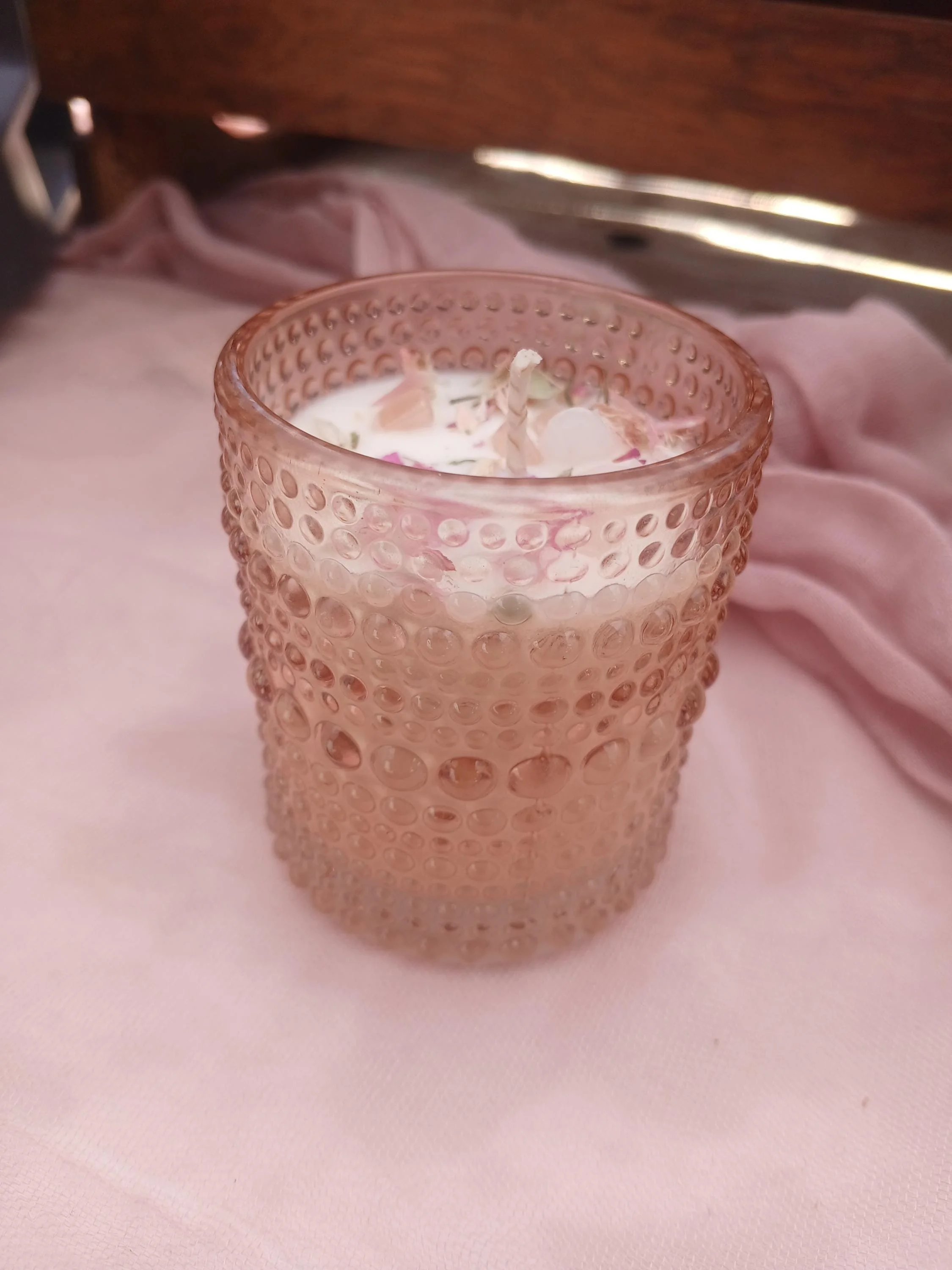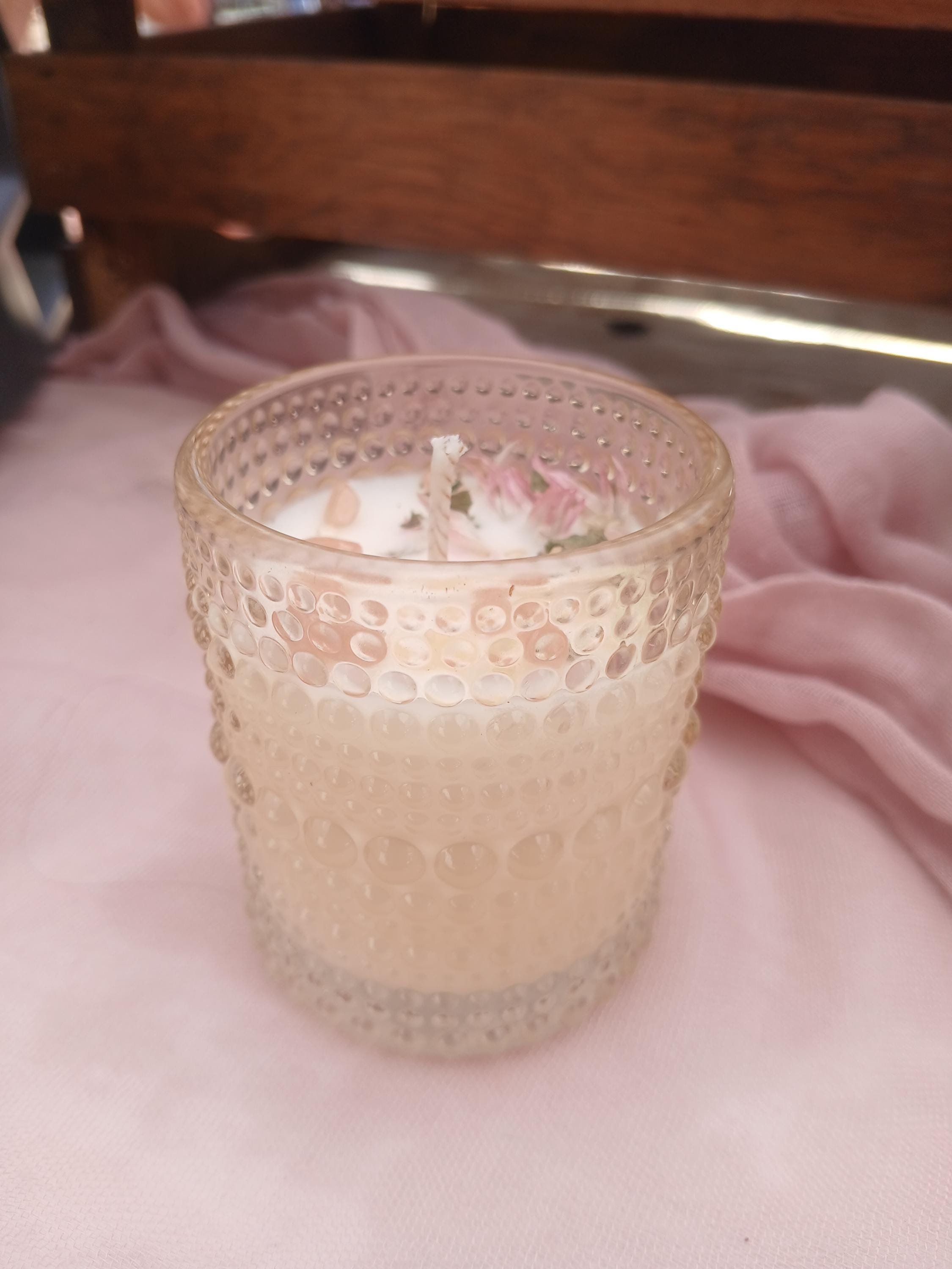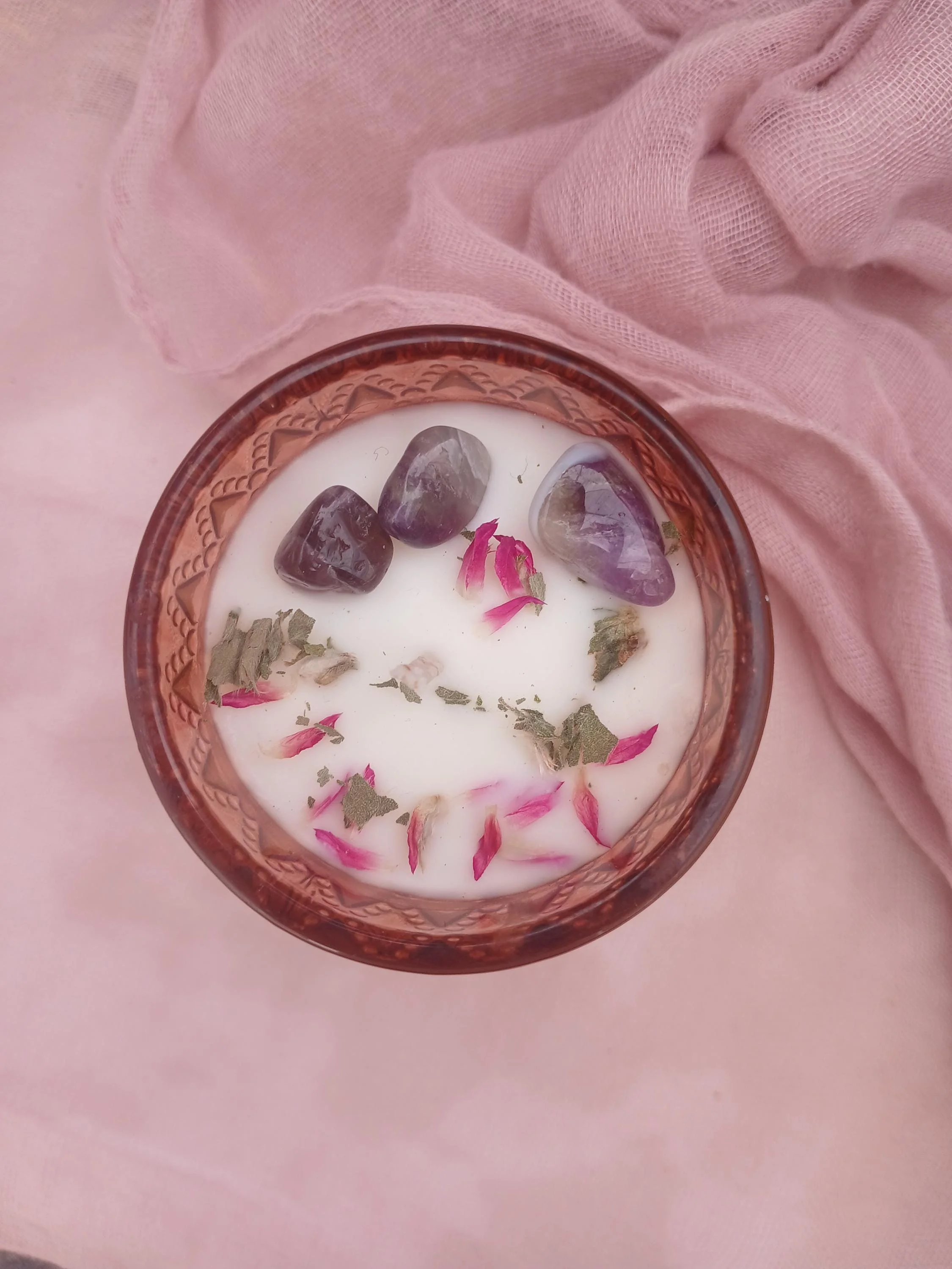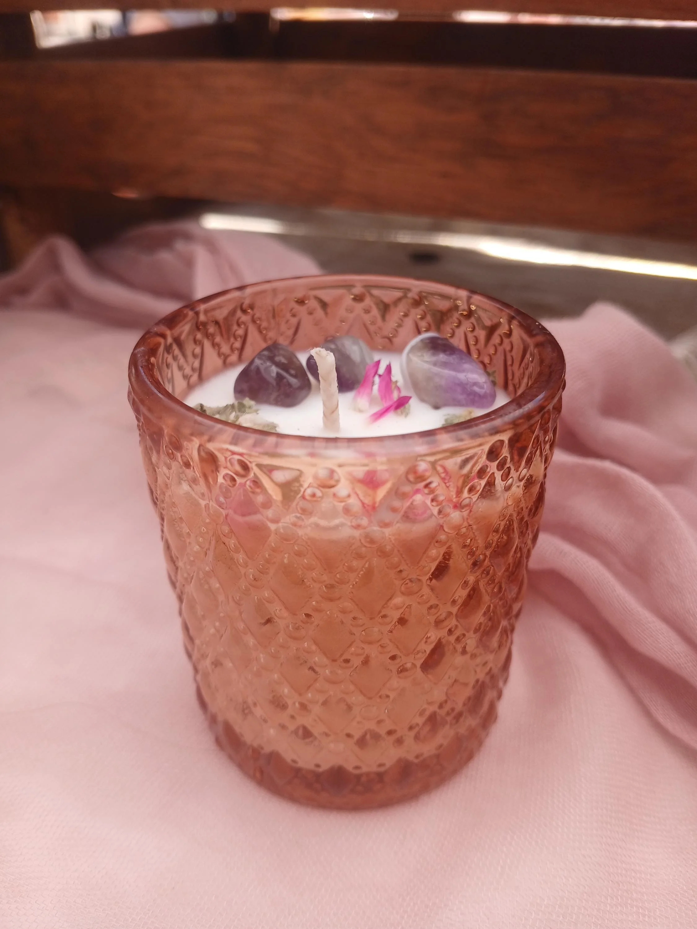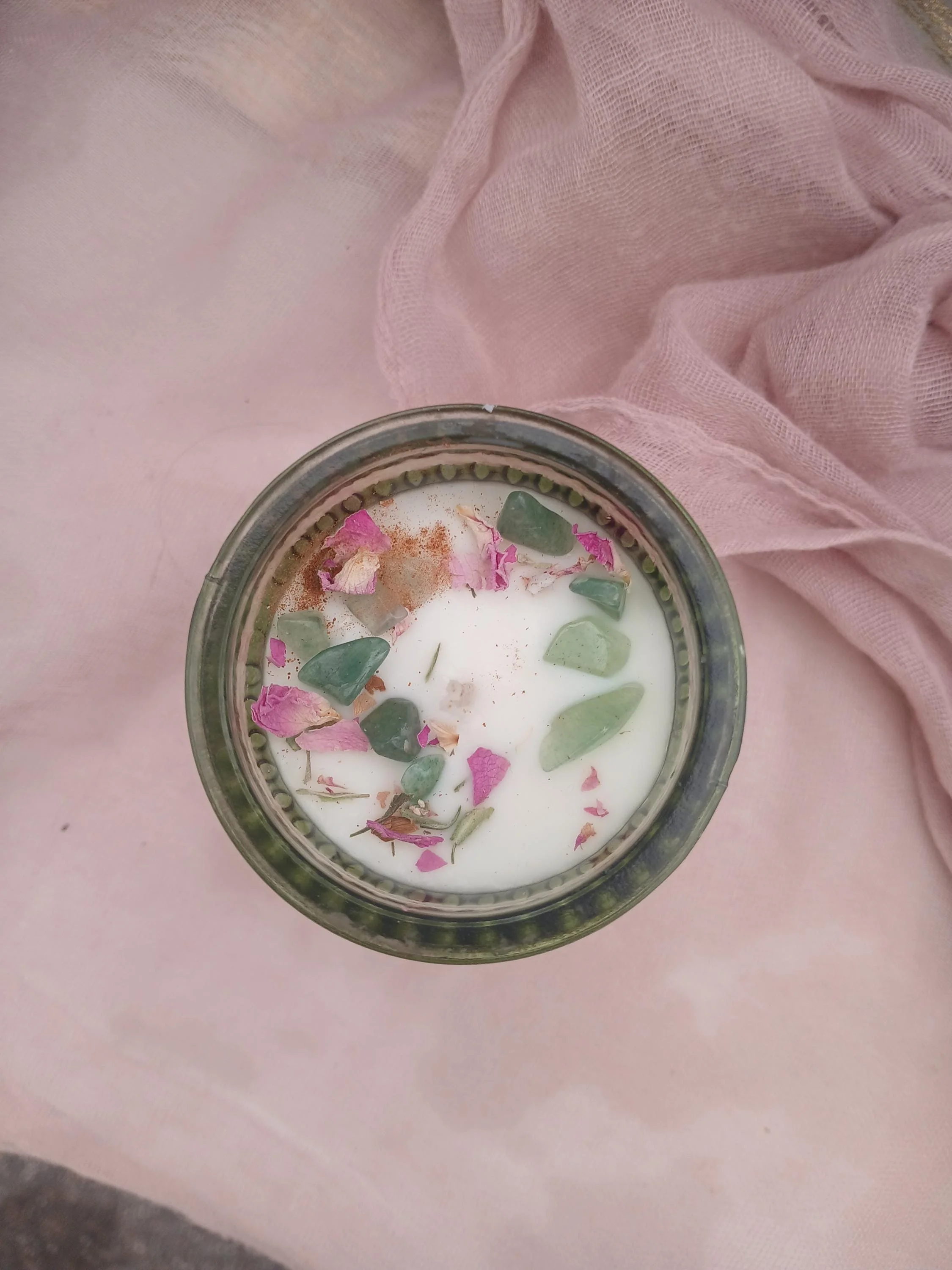 On top - pink salt, rose bud and petals, cherry blossom petals, rose quartz and carnelian