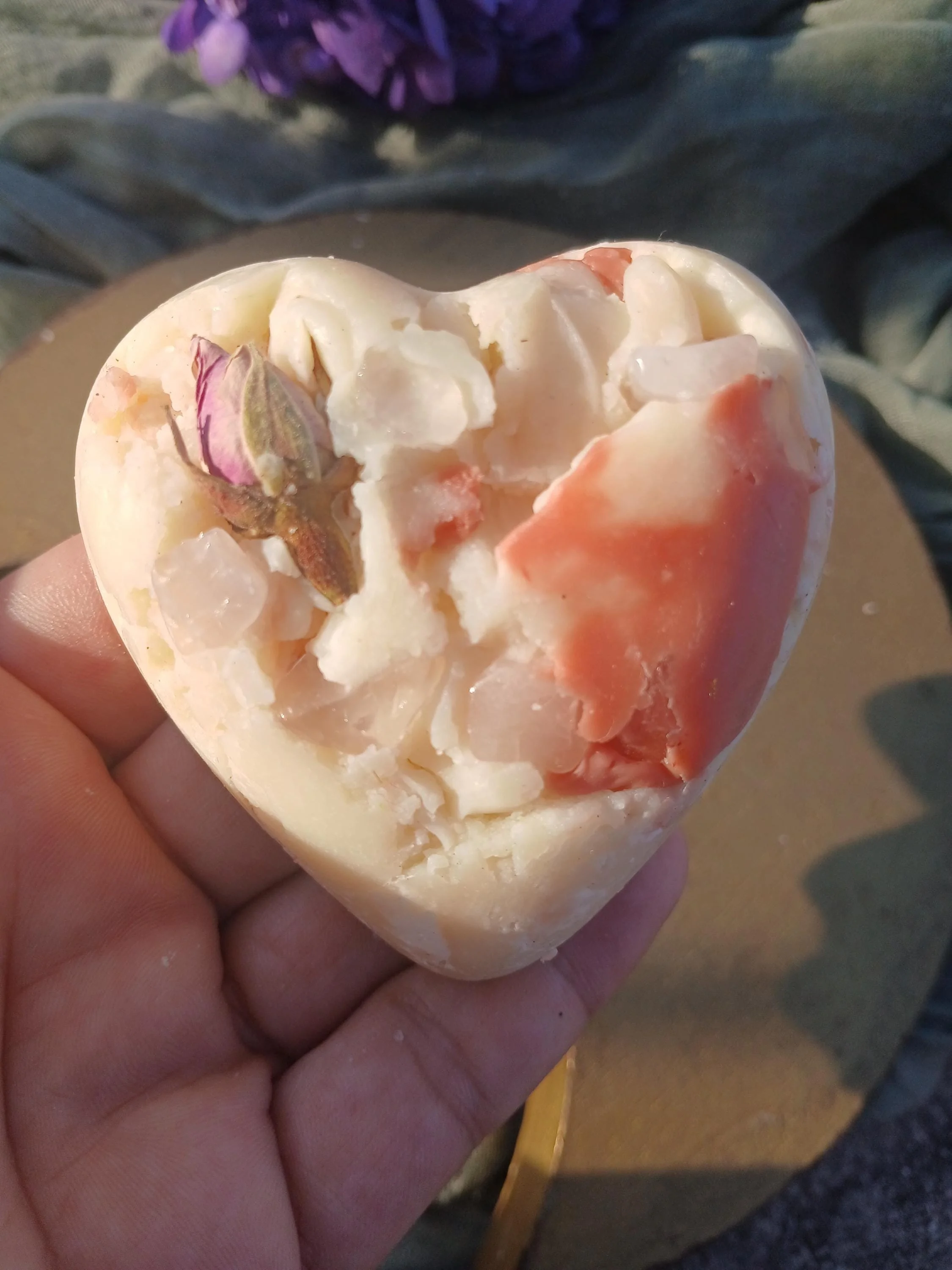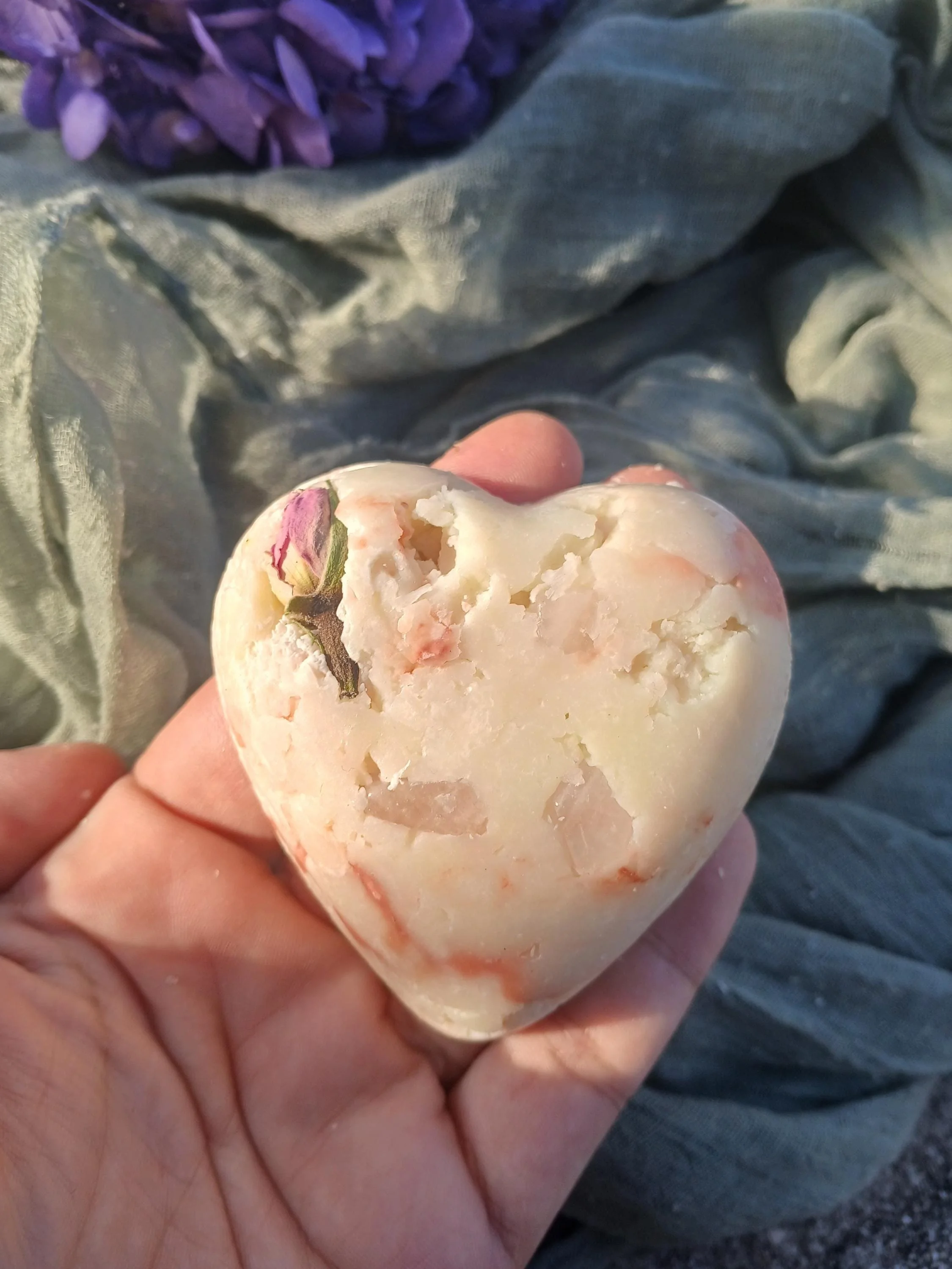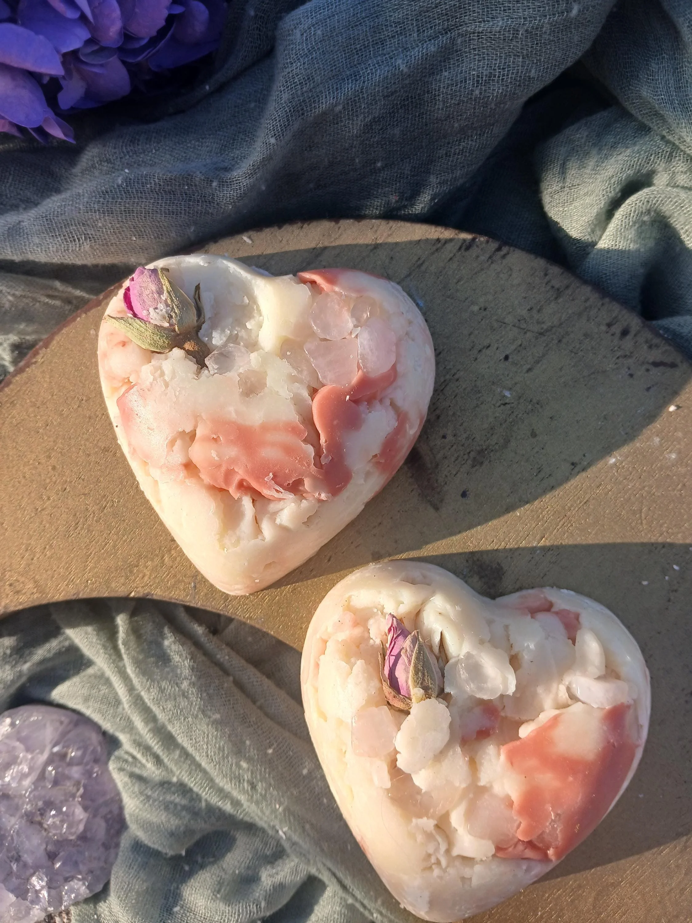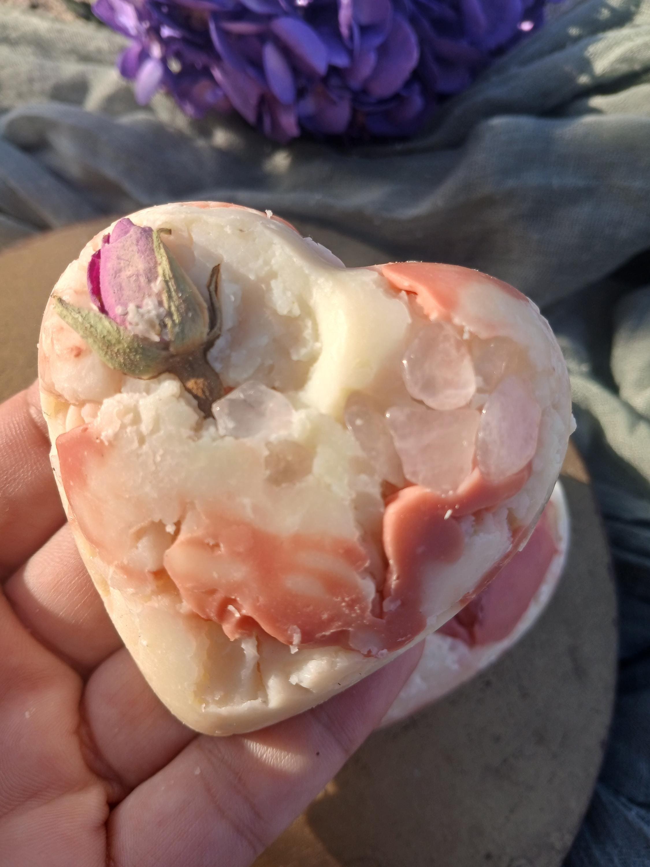 Each soap bar also contains a few rose quartz chips that can be sprinkled in your self-love altar. Rose quartz is known as the stone of unconditional love, it's believed to help with harmony, compassion, forgiveness, and heart healing.