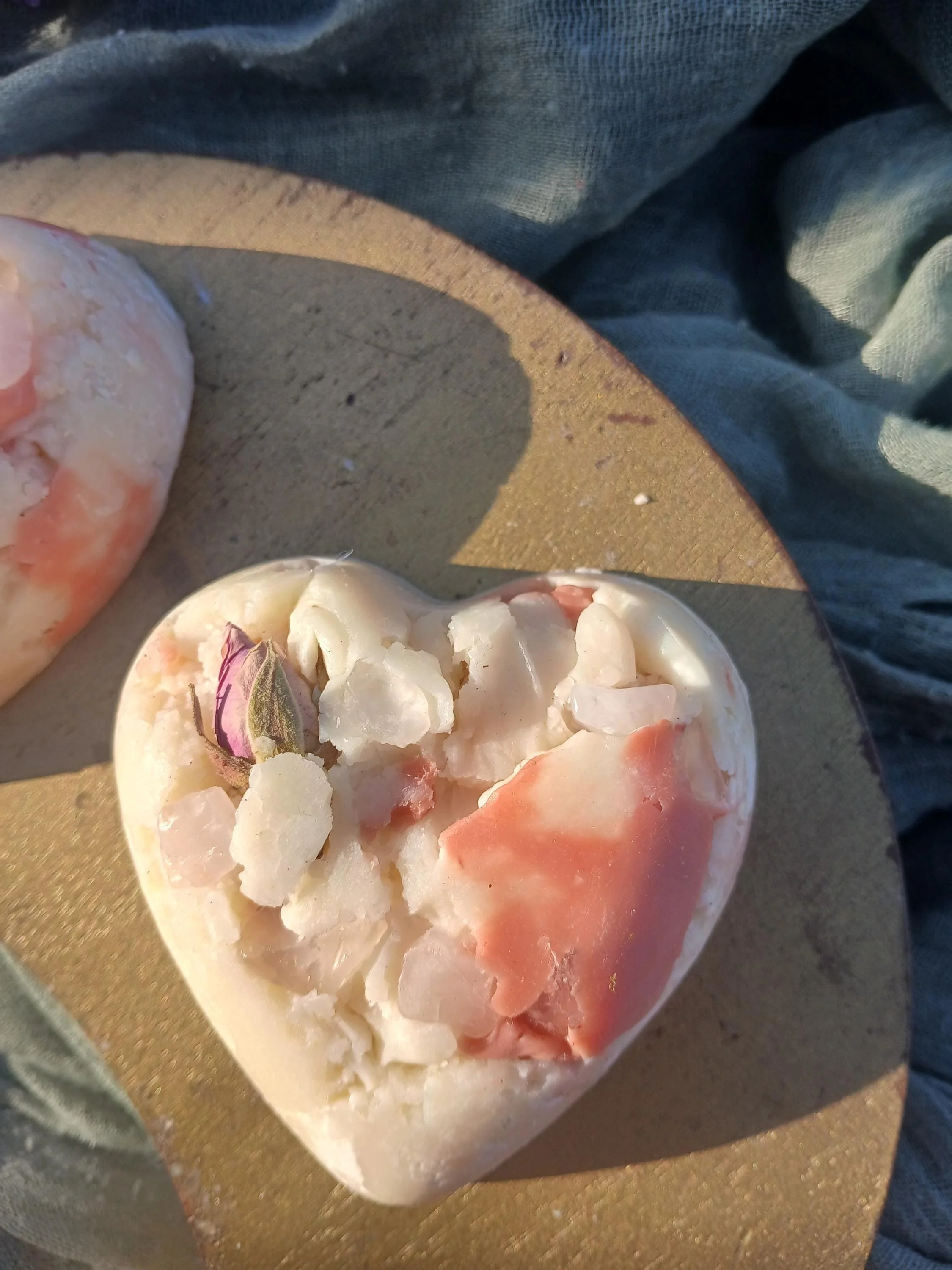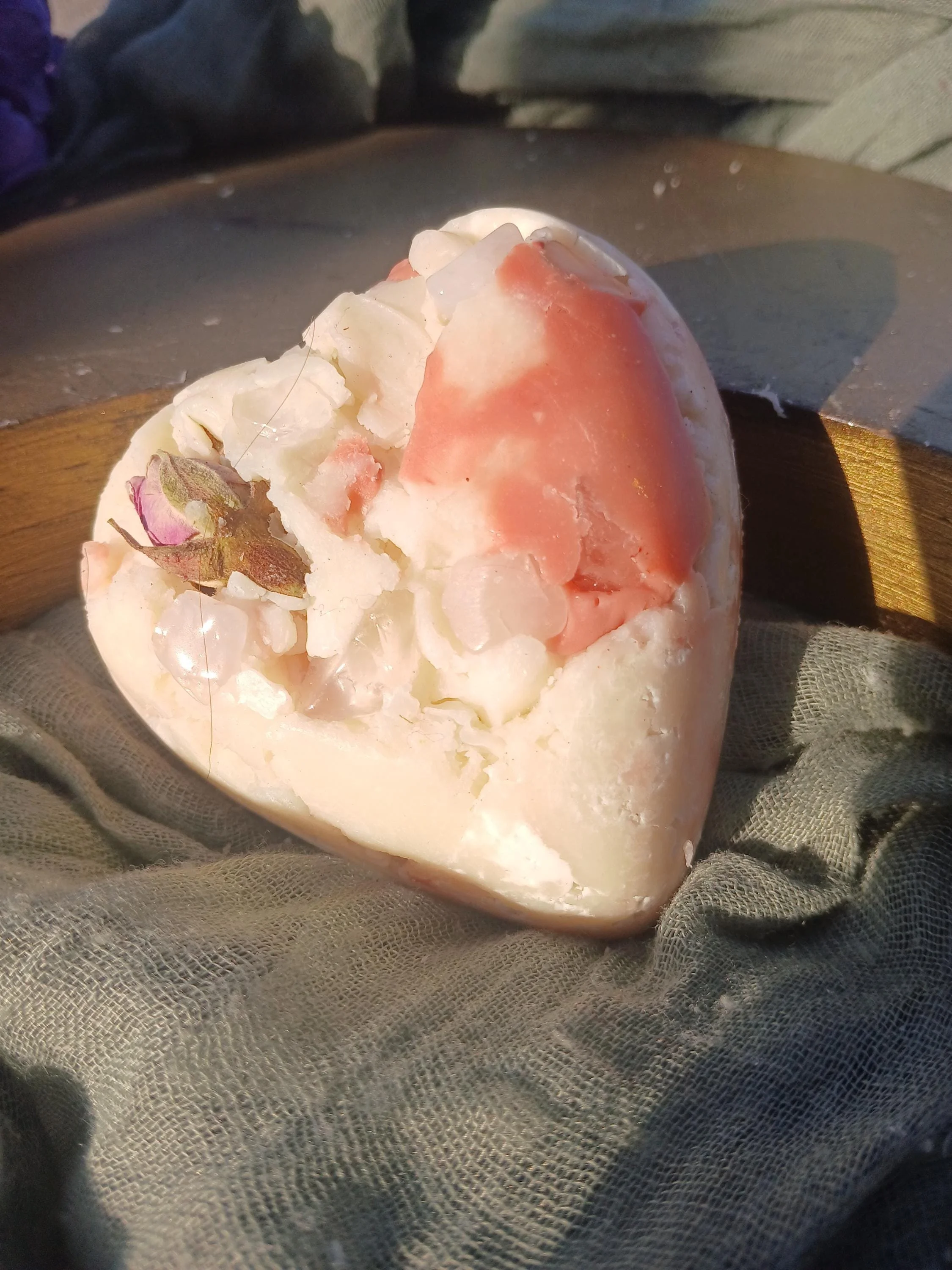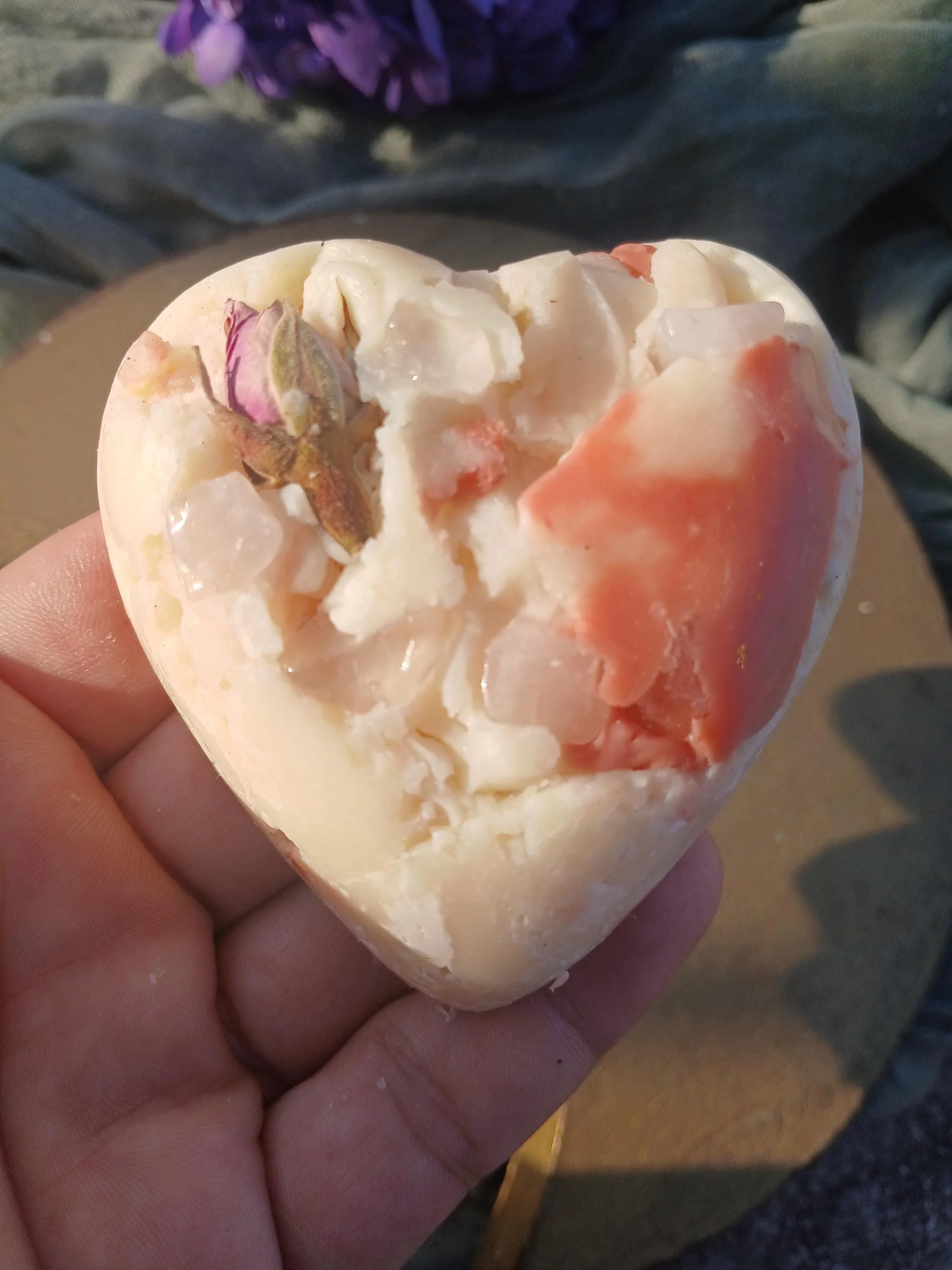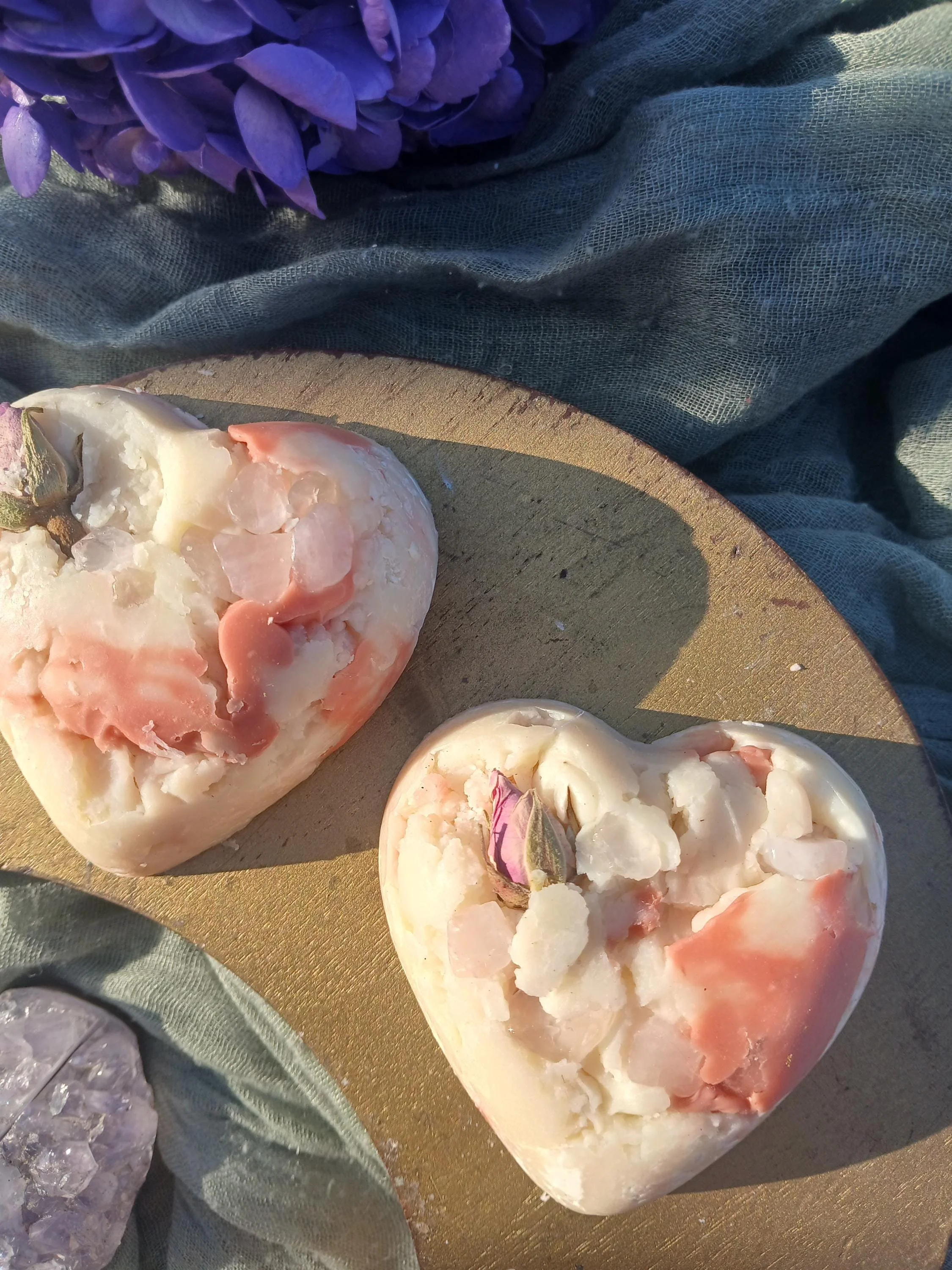 Each soap bar also contains a few rose quartz chips that can be sprinkled in your self-love altar. Rose quartz is known as the stone of unconditional love, it's believed to help with harmony, compassion, forgiveness, and heart healing.
