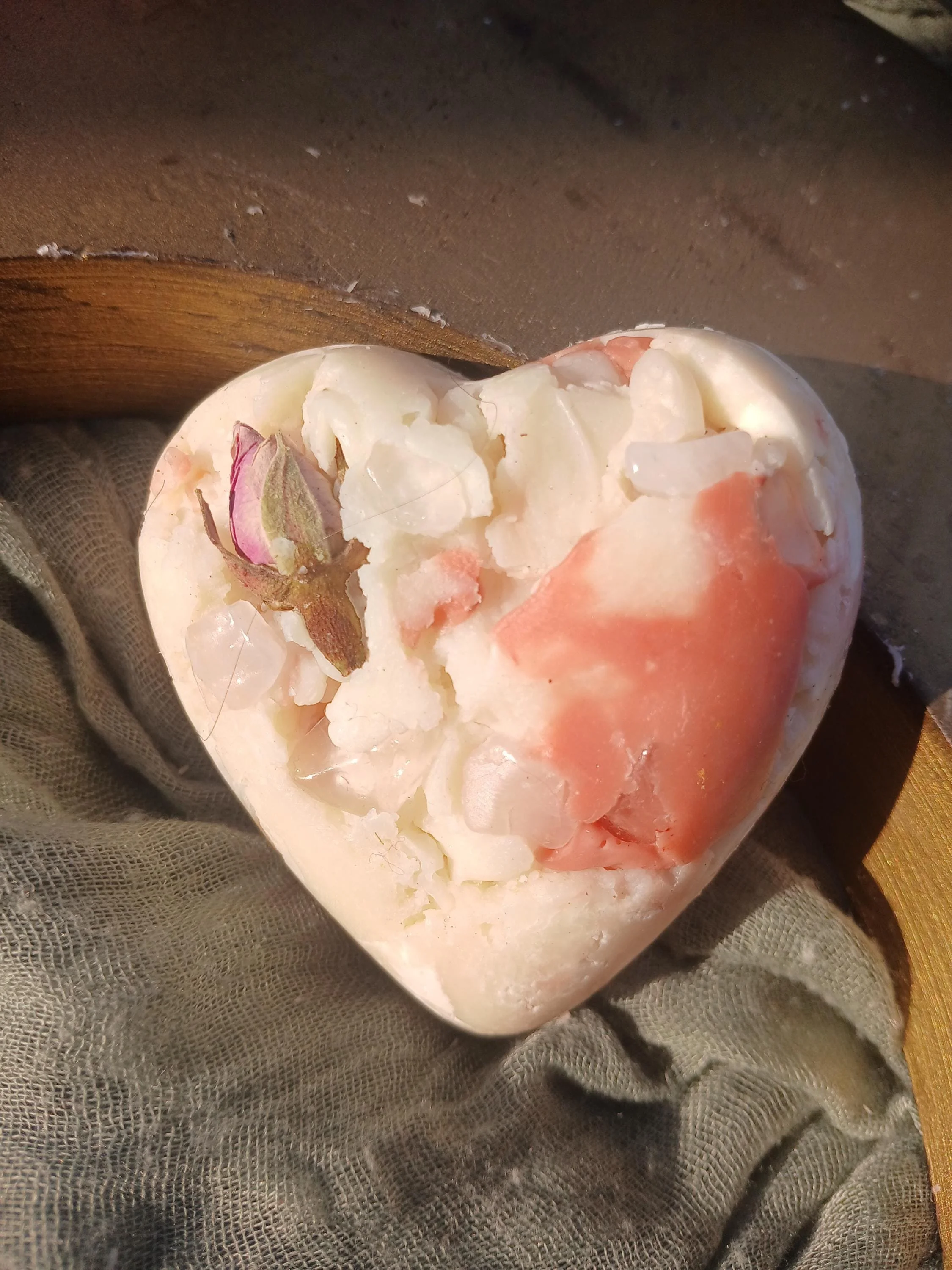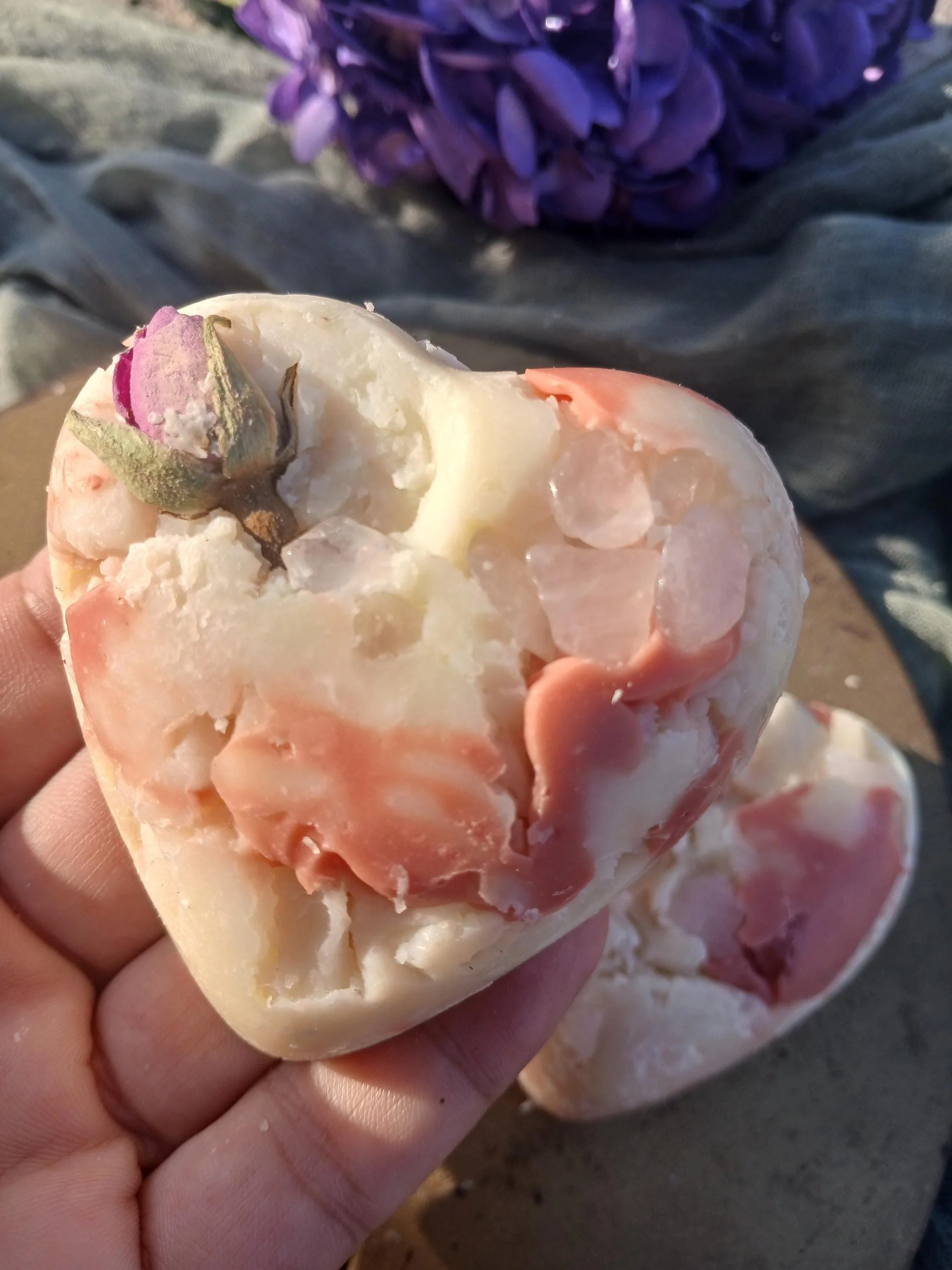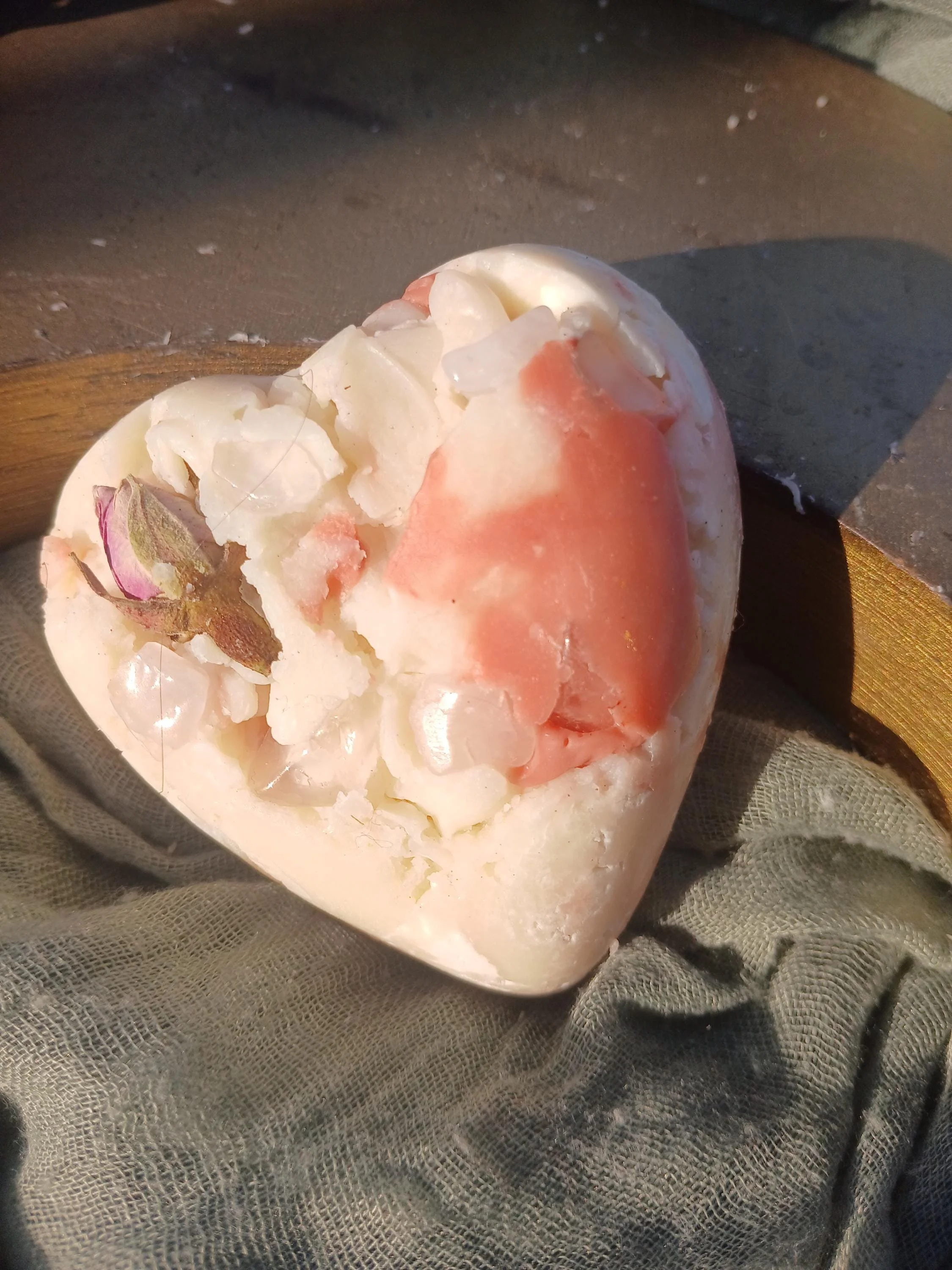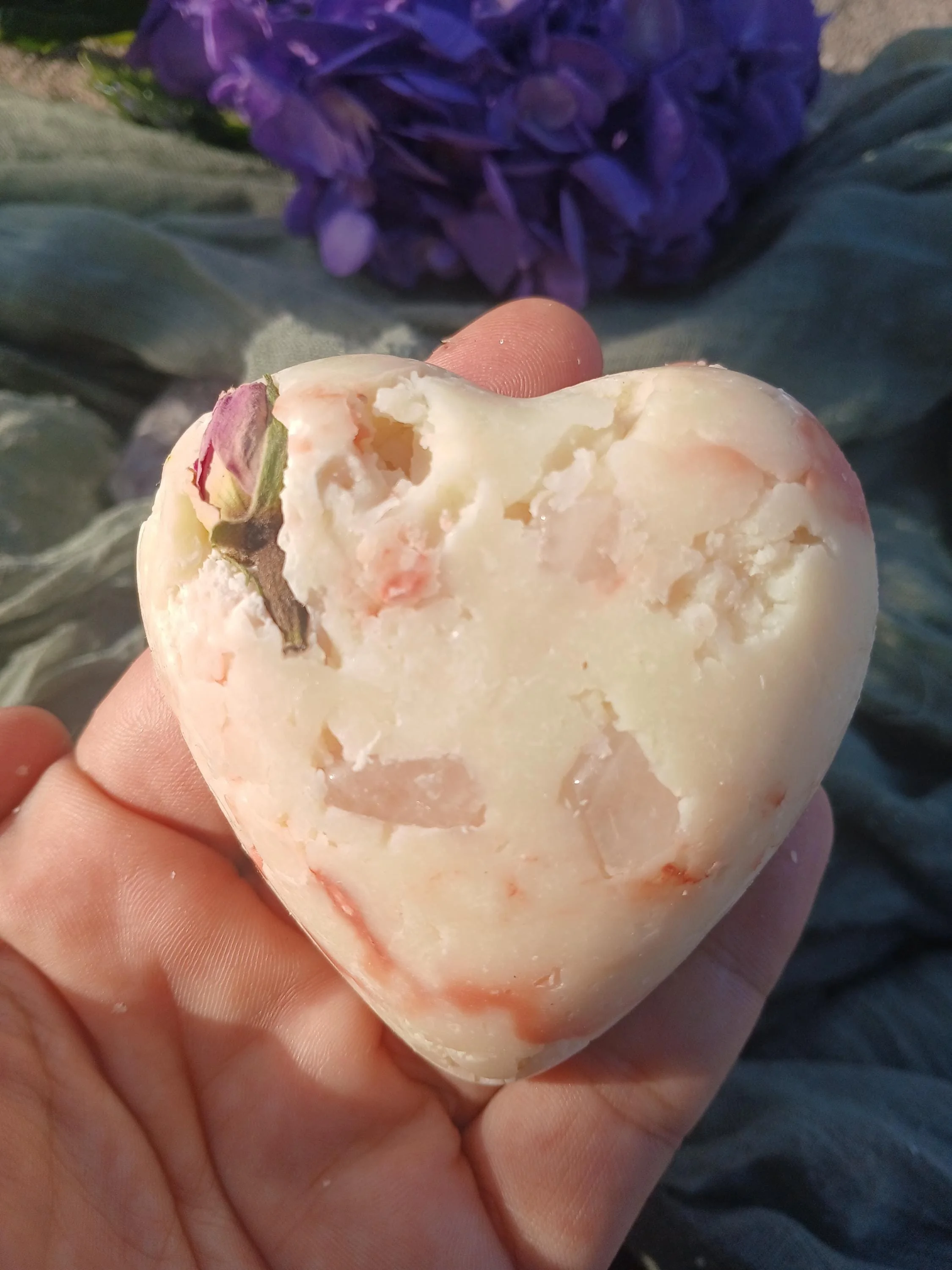 Each soap bar also contains a few rose quartz chips that can be sprinkled in your self-love altar. Rose quartz is known as the stone of unconditional love, it's believed to help with harmony, compassion, forgiveness, and heart healing.