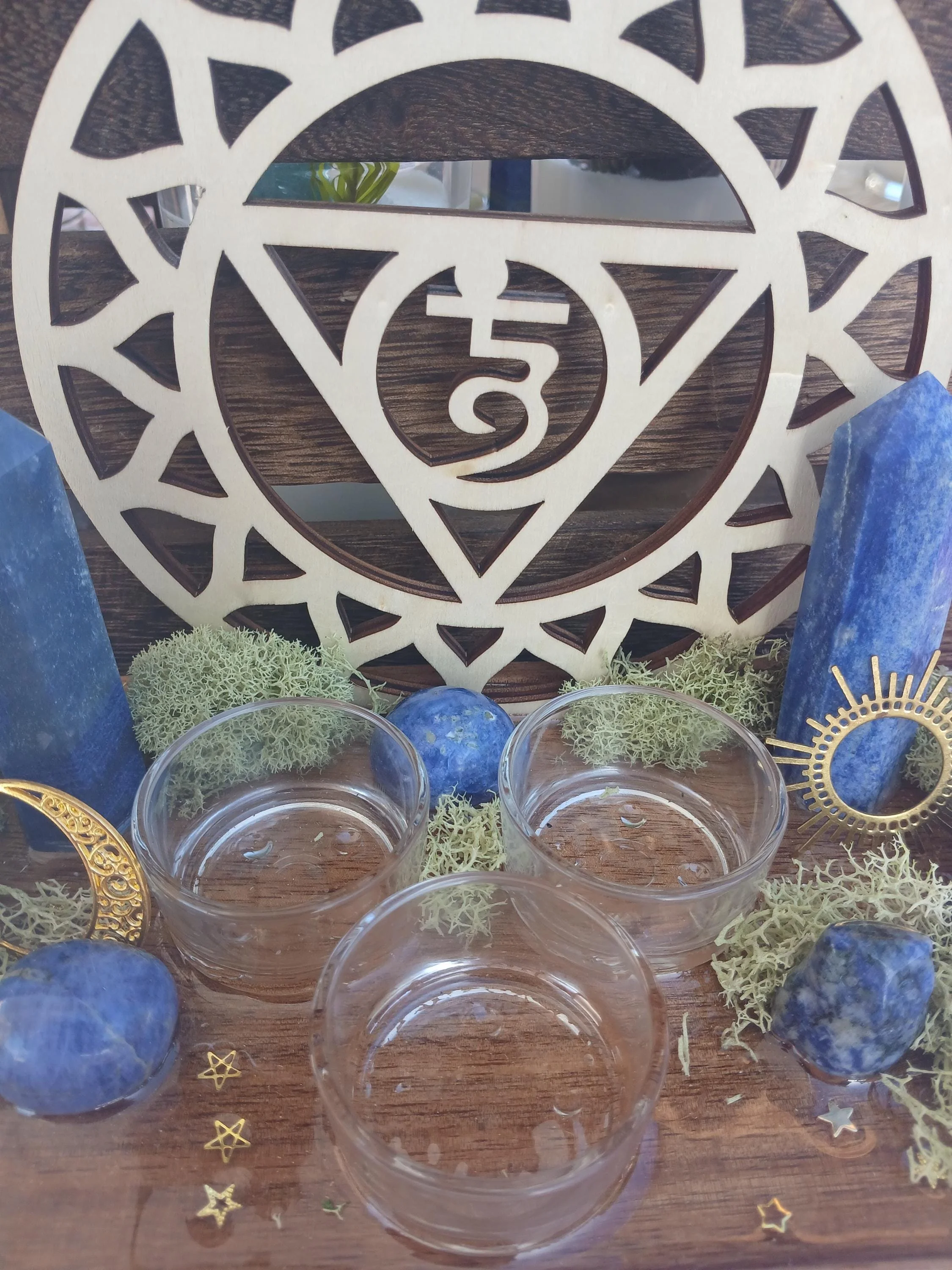 This one of a kind altar features a wooden backdrop with the throat chakra symbol. This ancient symbol represents the energetic center of your body that is responsible for expression, communication, truth, and understanding. These crystals can also support the third eye chakra, the center for intuition, insight, and imagination.