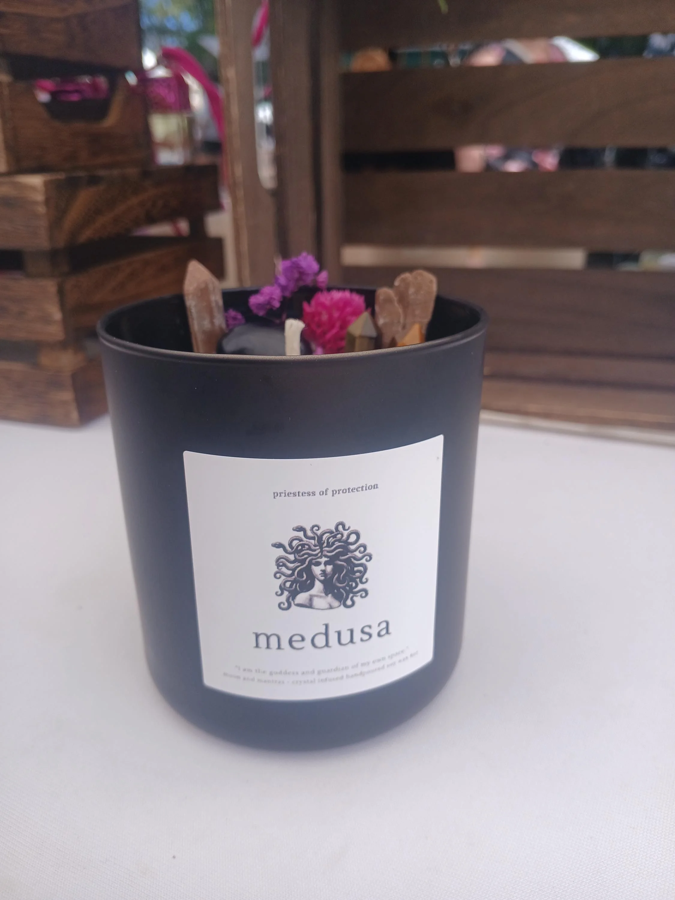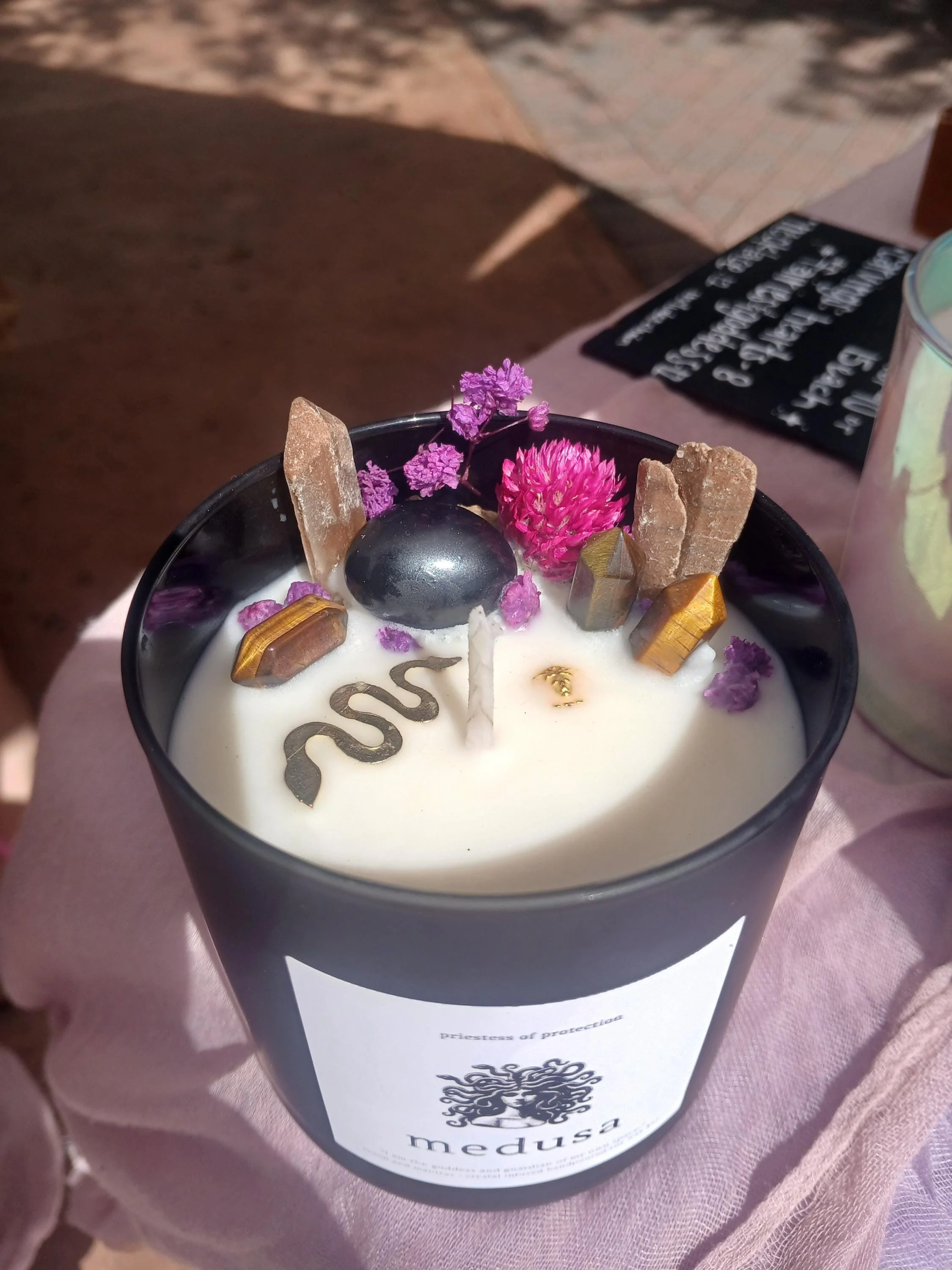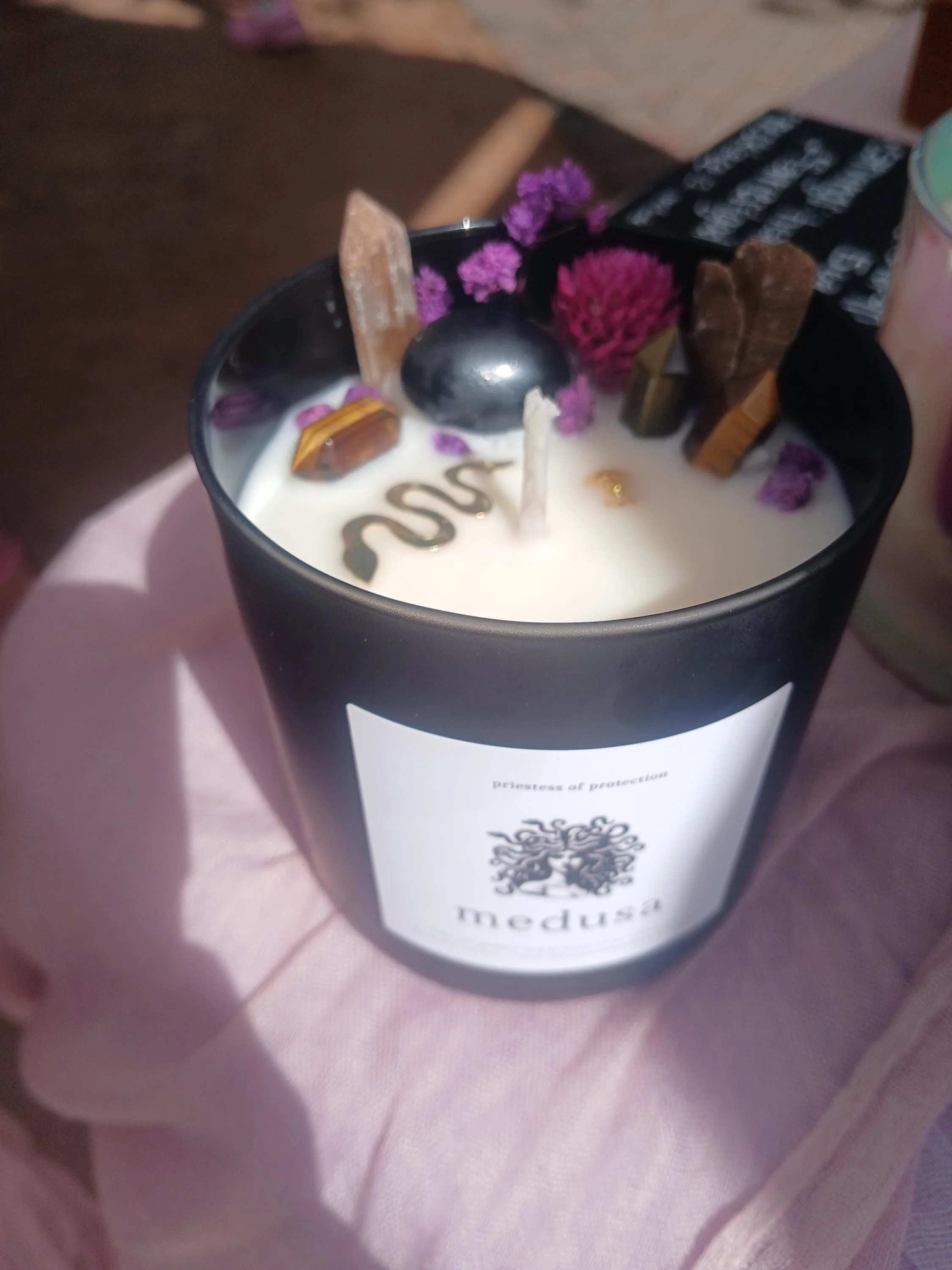 Each of these limited edition candles is carefully crafted to honor the dark feminine energy of the powerful priestess Medusa, and is infused with crystals and herb oils for confidence, strength, and protection. Theyre perfect for creating a sacred space or reclaiming your feminine energy.
