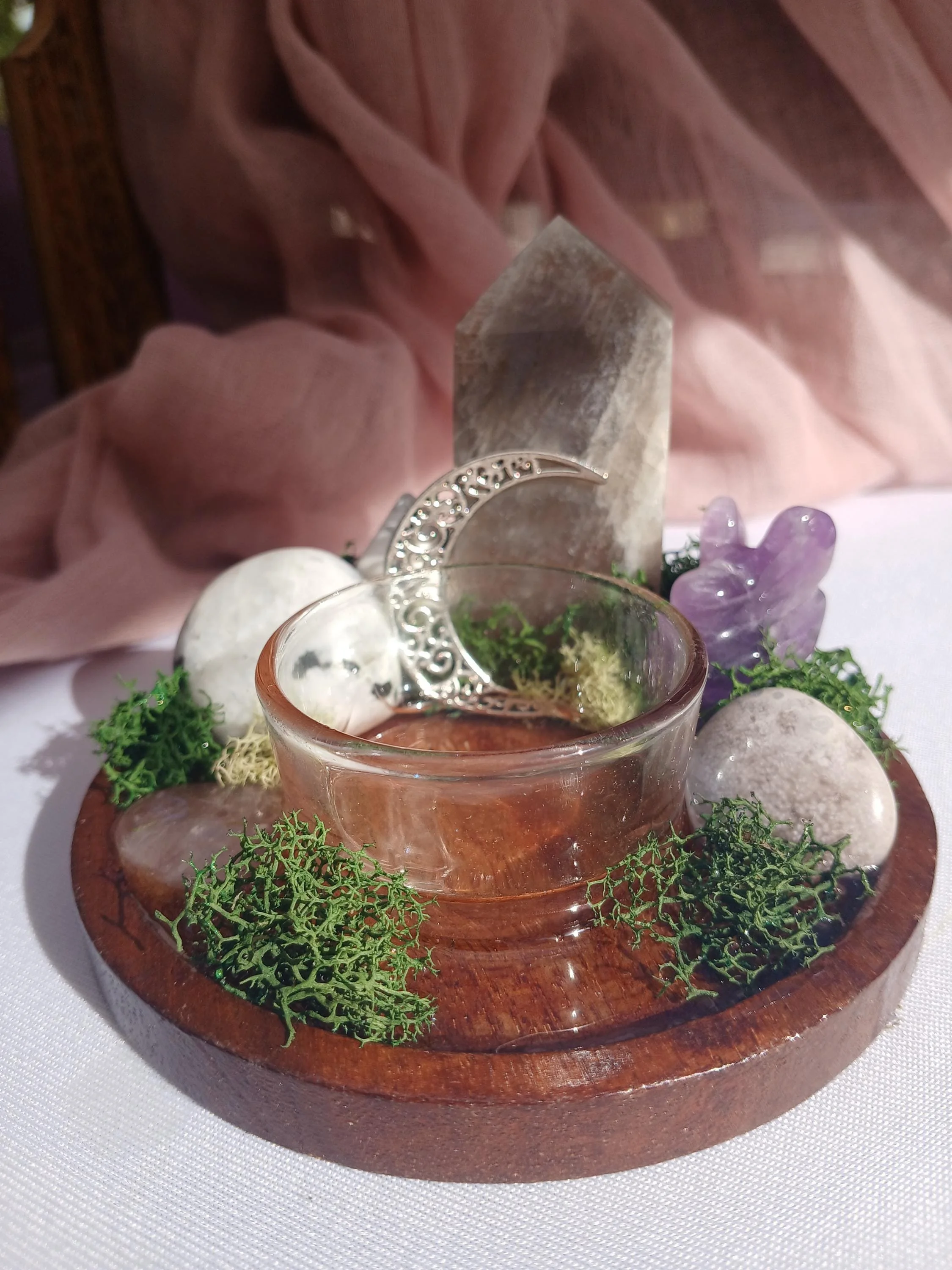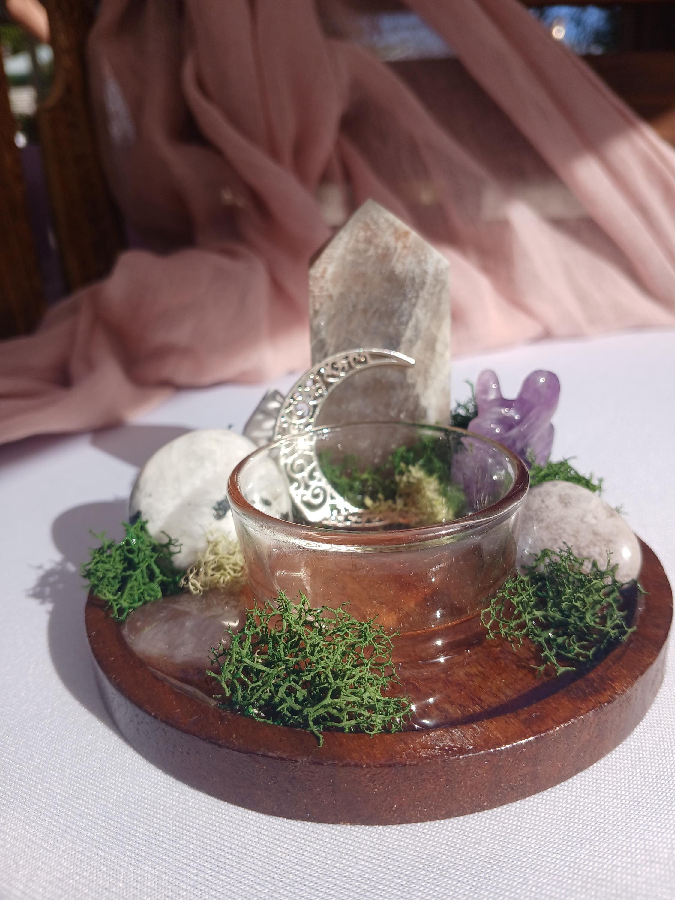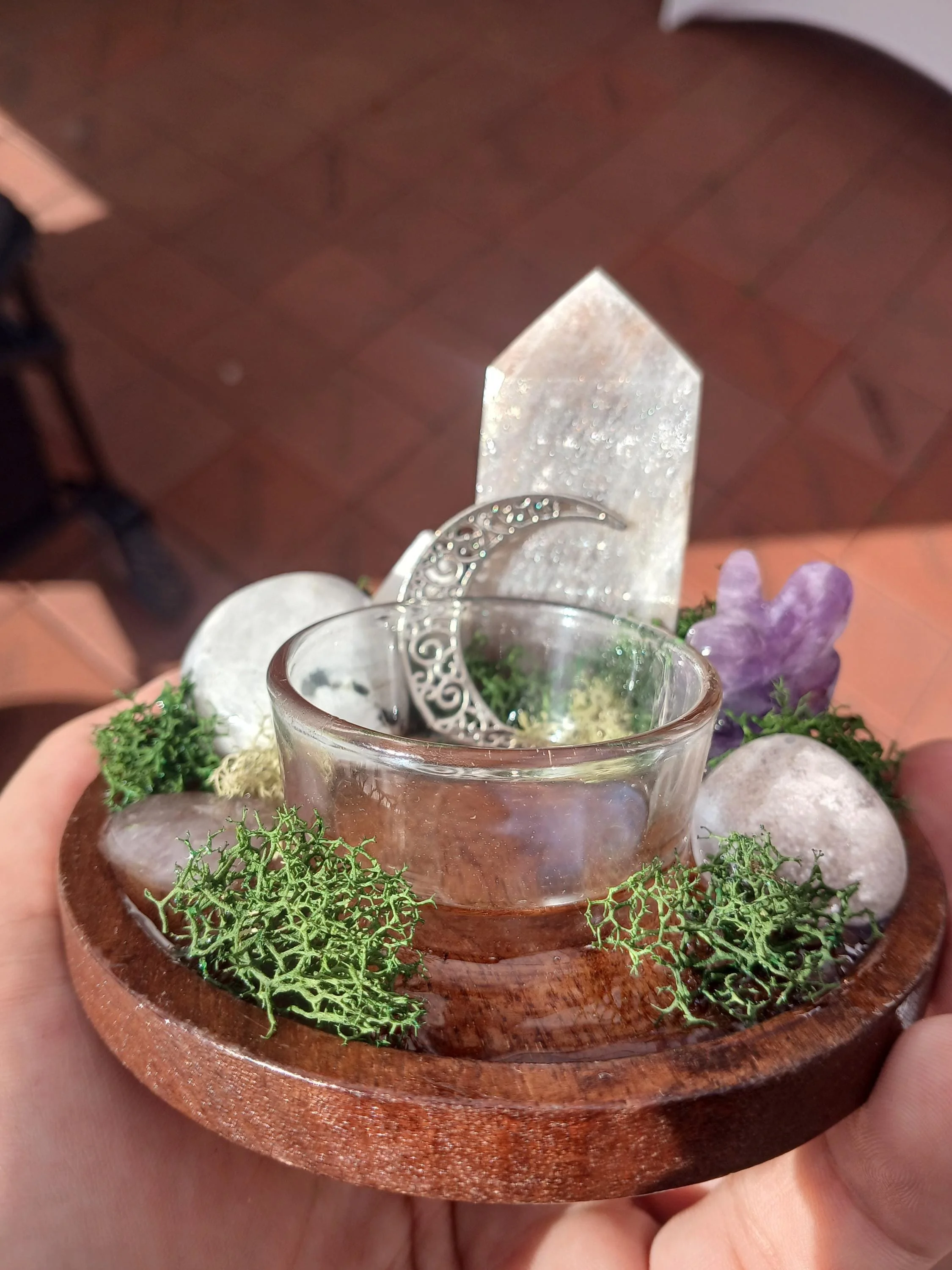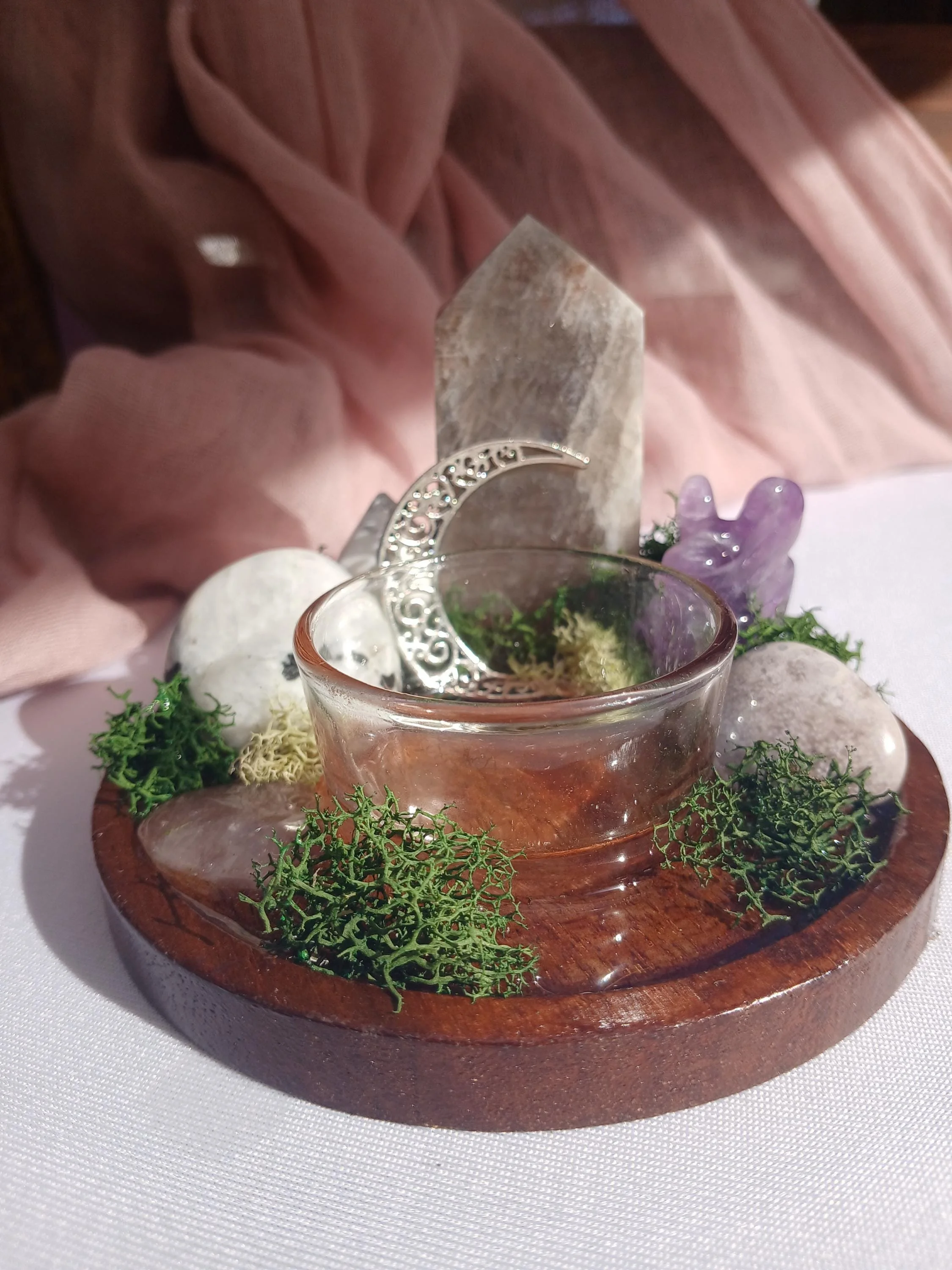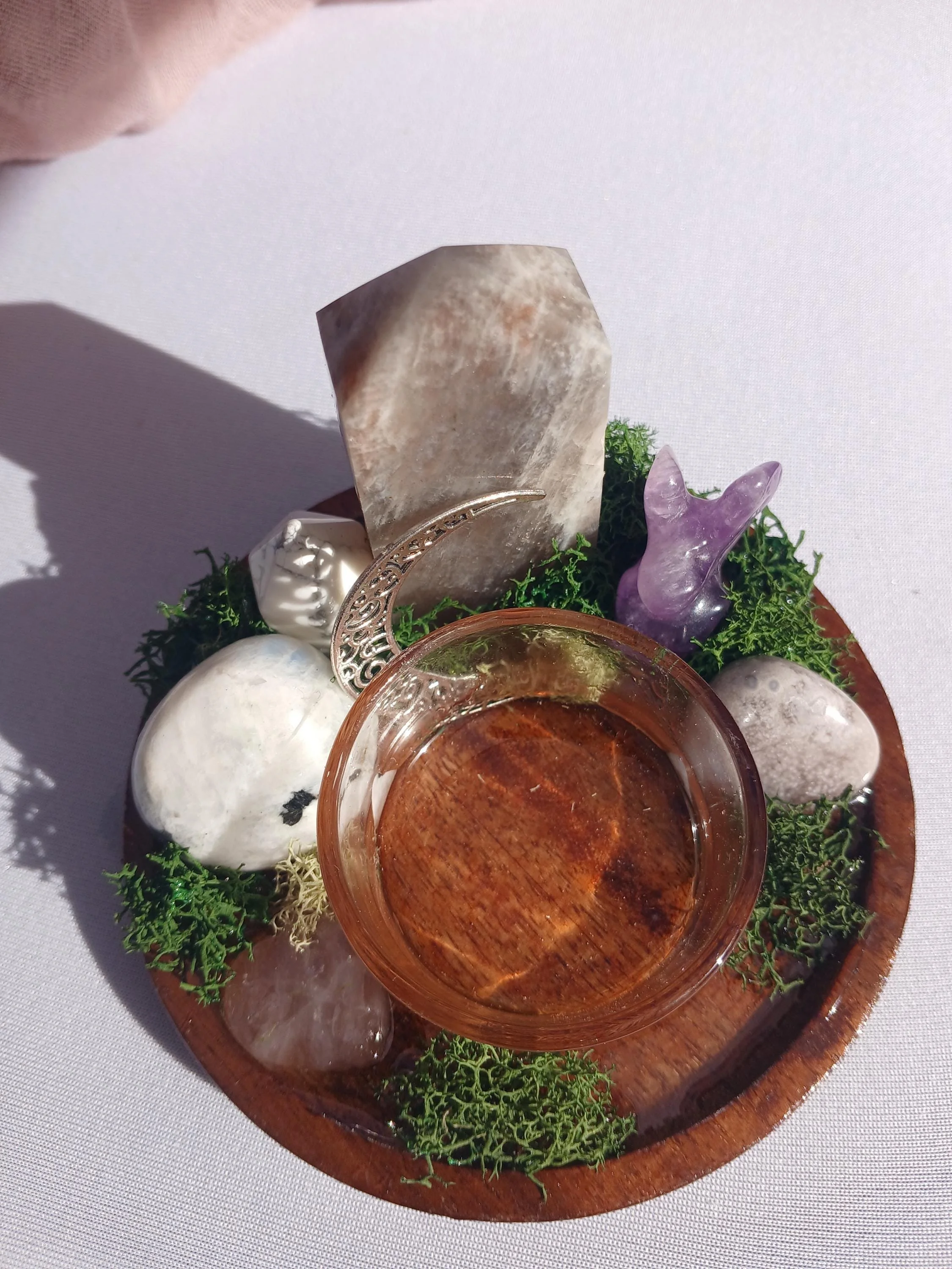 A tealight holder is added along with locally harvested moss and a silver moon charm. these altars are set in resin and can be easily transported, cleaned and enjoyed for years to come.