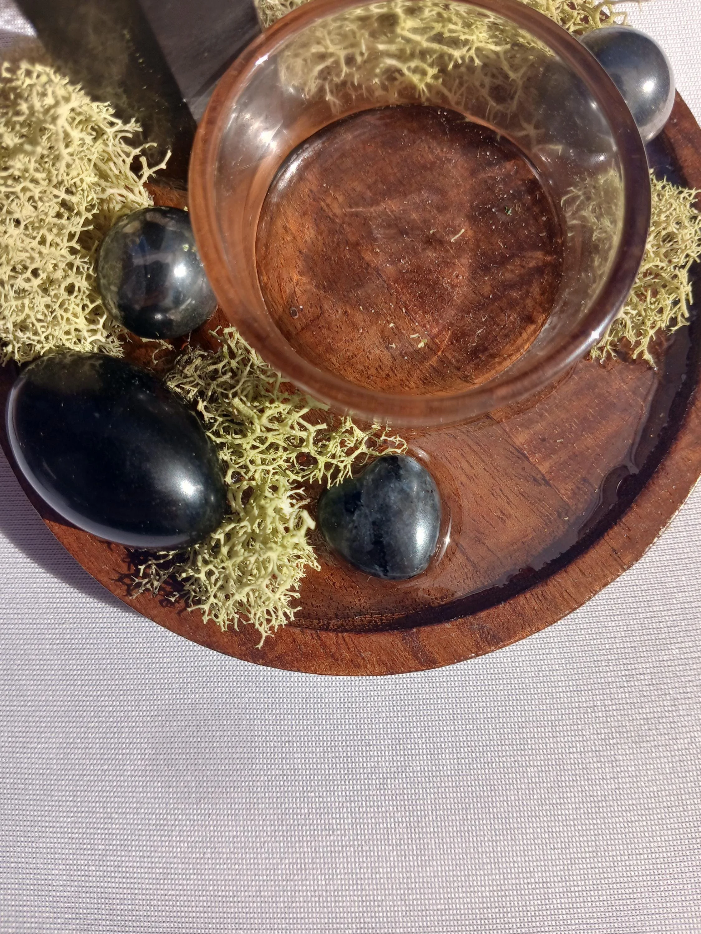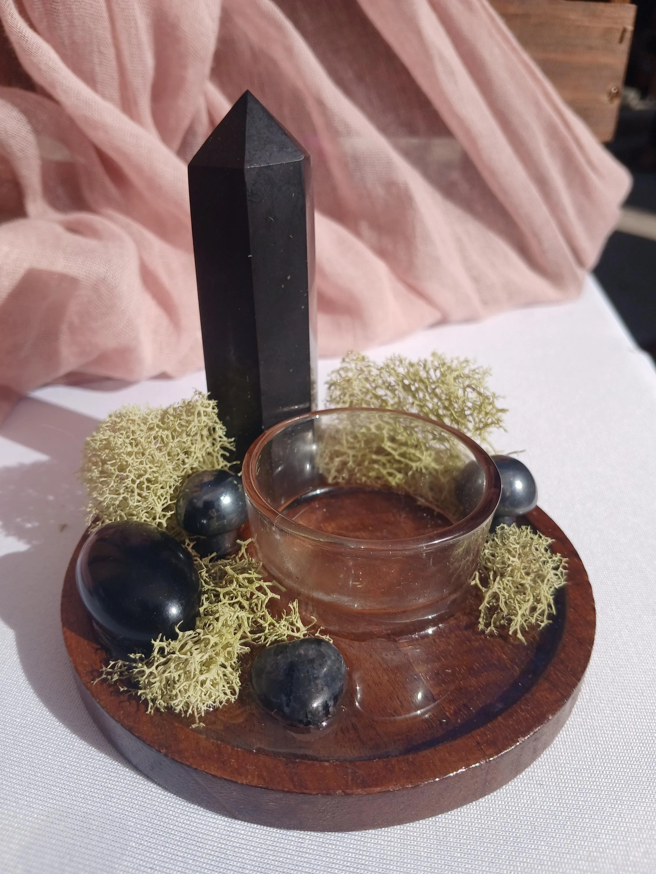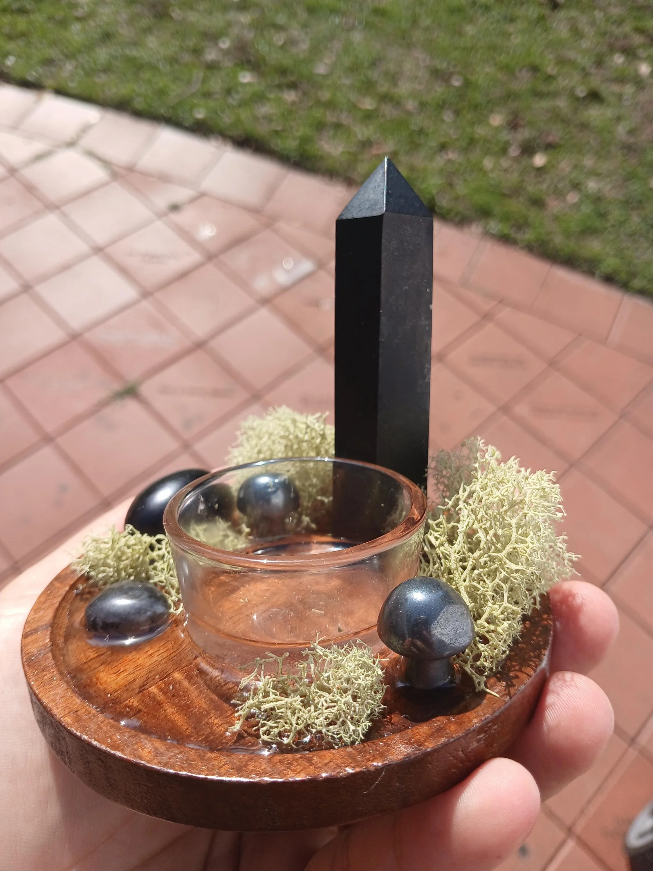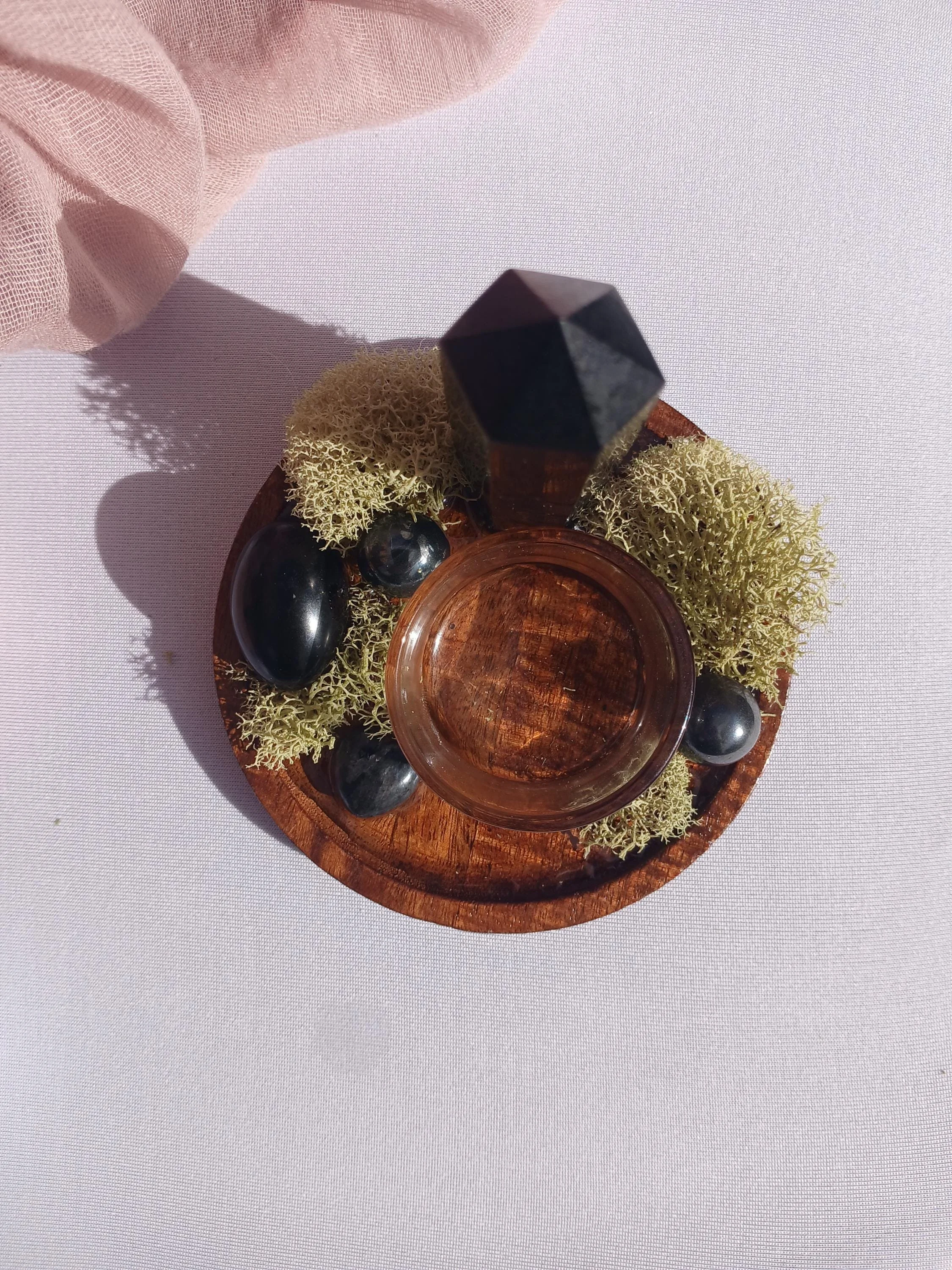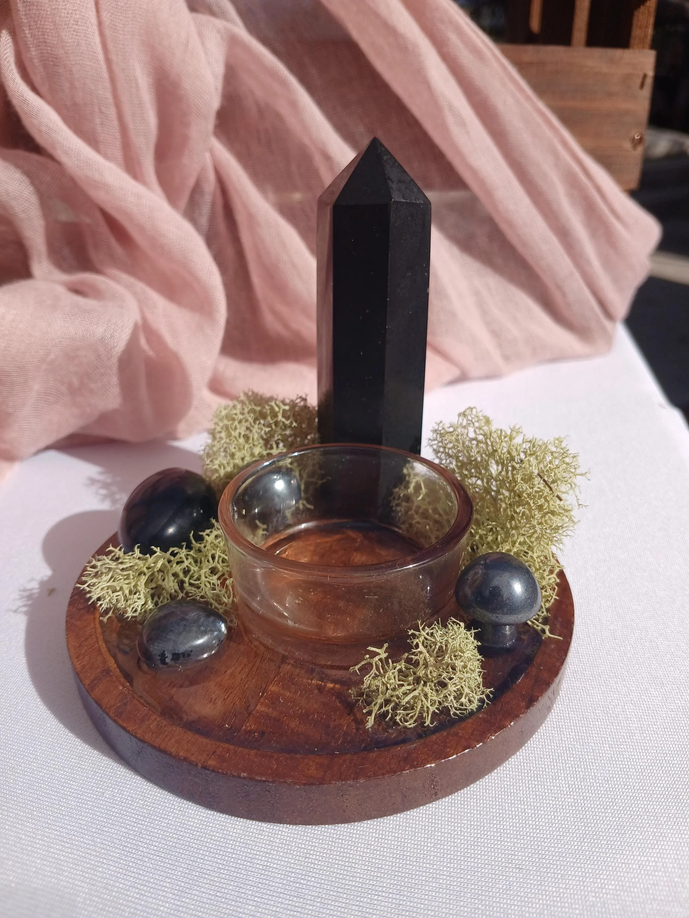 Handcrafted with resin on a smooth 4” acacia wood base, this altar features a powerful combination of crystals known for absorbing negativity, grounding energy, and offering strength and psychic protection.